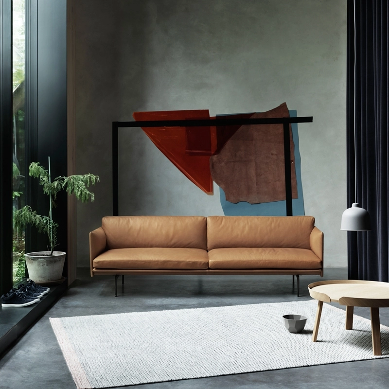 Outline est un canapé aux proportions généreuses, contrastant avec une apparence délicate et sophistiquée. La structure fine, les accoudoirs et les minces coussins de dossier maximisent l’espace disponible pour s’asseoir en disposant du meilleur confort. Muuto a ici la volonté de mêler utile et fonctionnel. Le canapé Outline dévoile une présence quasi architecturale dans l’intérieur contemporain. Les pieds effilés et discrets en métal laqué, sont nichés sous la structure, contribuant à l’allure légère du canapé. Pour Outline, le studio Anderssen & Voll n’a fait aucun compromis visuel ou fonctionnel. En effet, le canapé Outline dispose d’une assise profonde et confortable, ainsi qu’une extrême légèreté visuelle. Ses finitions en textiles ou en cuir, font du canapé Outline, un canapé d’exception au design rectangulaire. Les contours nettement dessinés, permettant de sortir des lignes classiques des canapés scandinaves des années 60, font l’originalité du canapé Outline. Ses lignes architecturales et raffinées, inspirées des influences scandinaves, montre un canapé accueillant, moderne, délicat, sophistiqué et intemporel. Les lignes nettes mettent en valeur la qualité du cuir haut de gamme, signé par la célèbre maison Camo.  Le cuir aniline pleine fleur, permet un toucher souple et agréable ainsi qu’un confort d’usage. De plus, son rembourrage de qualité supérieure offre une assise douce. Sa structure solide est fabriquée en aluminium peint par poudrage. L’assise, le dossier et les accoudoirs peuvent également être recouverts d’étoffe haut de gamme. Grâce à son charme discret, le canapé Outline by Muuto s’intègre dans tous les intérieurs, aussi bien au milieu du salon que contre un mur, dans un style contemporain ou industriel. Ce canapé est disponible en 2 ou 3 places.