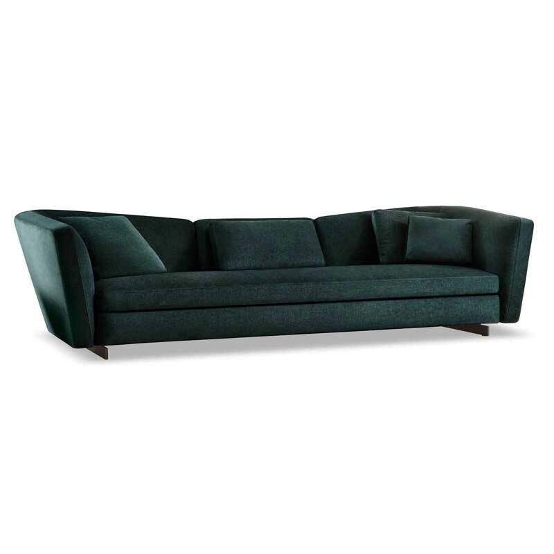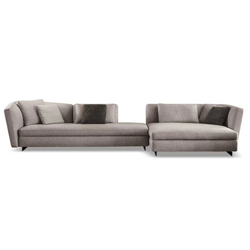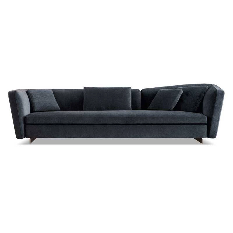 Minotti, repose sur d’élégantes barres longitudinales en aluminium peint couleur Bronze qui allègent les volumes tout en les soulevant du sol.