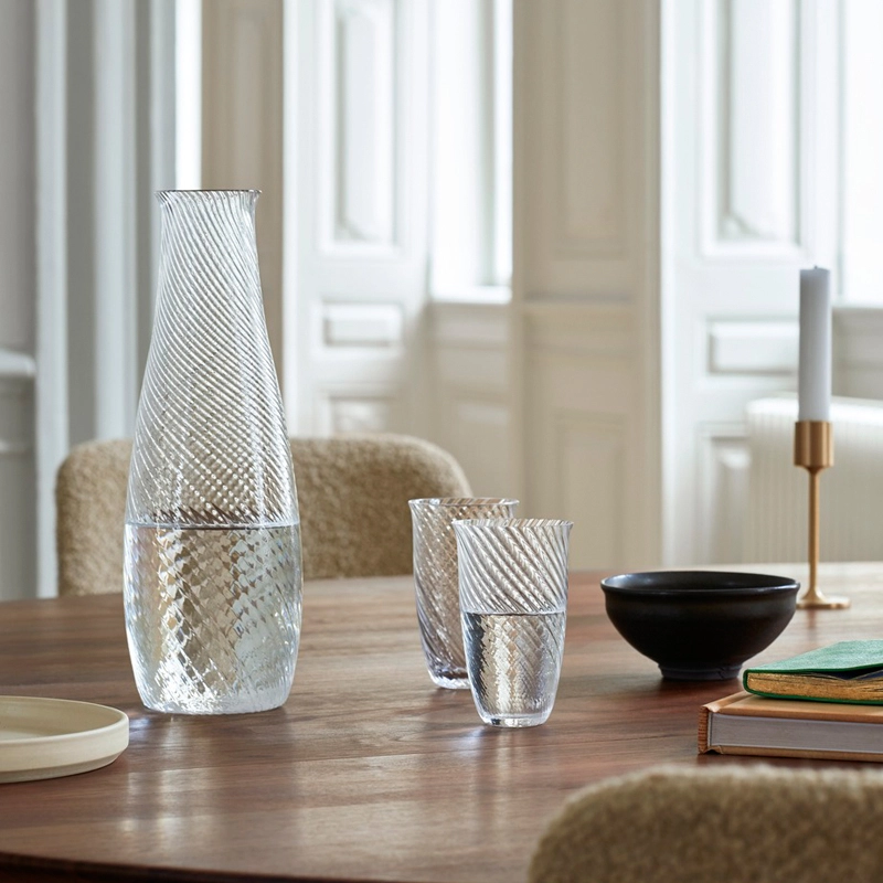 D'apparence simple et résolument moderne, ce set de deux verres présente un subtil motif tourbillon qui reflète la nature tourbillonnante de l'eau. Les verres sont dotés d'un bord évasé qui crée un endroit naturel où la lèvre se repose. Ils font partie de Collect, une collection de tissus d'ameublement et d'objets de maison magnifiquement conçus par Space Copenhagen pour And Tradition. Décliné en deux tailles, chaque modèle est vendu par paire. Une carafe de la même collection est également disponible pour créer un ensemble très raffiné.