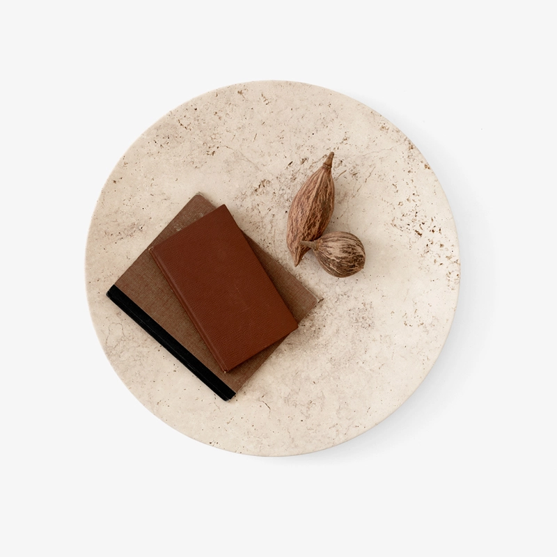 Conçue par Space Copenhagen pour And Tradition, ce centre de table poli à la main fait partie de la série Collect, une ligne de tissus d'ameublement et d'objets pour la maison magnifiquement conçus. Fabriquée à partir de pierre de travertin beige, chaque coupe est une pièce à la texture unique avec son propre motif naturel.