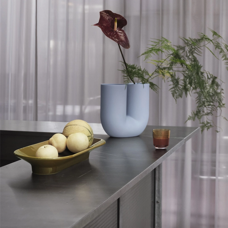 La coupe Mere dessinée par le Studio Kaksikko et éditée par Muuto est une pièce sculpturale aux finitions raffinées. Elle est aussi belle au centre d'une table qu'en exposition ailleurs dans la maison, utilisée pour contenir des objets ou simplement comme objet de décoration. Sa forme caractéristique est simple et ingénieuse, créée à partir de la ligne centrale qui se replie pour former un récipient. Mere est surélevée par une base discrète, ce qui donne l’impression que la coupe flotte. Le centre de table Mere de Muuto est recouvert d'une finition très brillante qui renforce son aspect sculptural. La coupe Mere convient a un usage alimentaire.