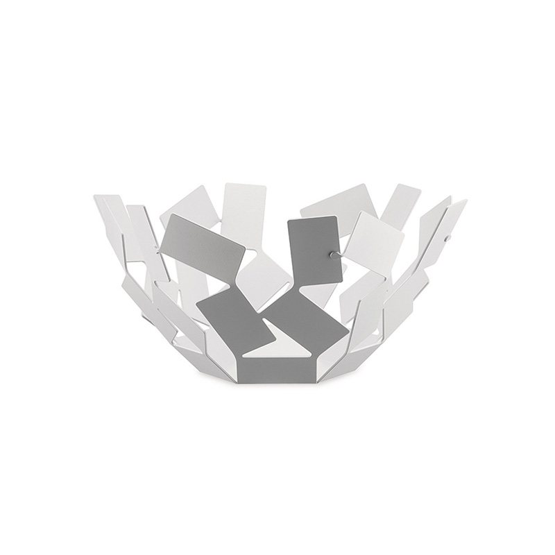 La Stanza Dello Scirocco est une collection sculpturale créée par Mario Trimarchi, architecte de la génération « mains libres », pour la célèbre marque italienne Alessi. Réalisées à partir d'une feuille d'acier découpée et pliée, ces corbeilles sont incroyablement graphiques et aériennes, et se distinguent par leur composition et les jeux d'ombres et de lumières qu'elles créent. Tel un château de cartes en train de s'écrouler ou de petits papiers emportés par le vent, la Stanza Dello Scirocco puise son inspiration dans l'atmosphère d'un lieu magique : la pièce que l'on retrouve dans les maisons de la campagne sicilienne où l'on se réfugie pour échapper à la chaleur étouffante en attendant que le sirocco se calme. C'est une pièce sans fenêtre où la seule chose à faire est d'écouter le vent souffler à l'extérieur. Le centre de table et la corbeille à fruits sont disponibles en acier inoxydable ou colorés à la résine époxyde, pour décorer une table de salle à manger ou le plan de travail de la cuisine.
