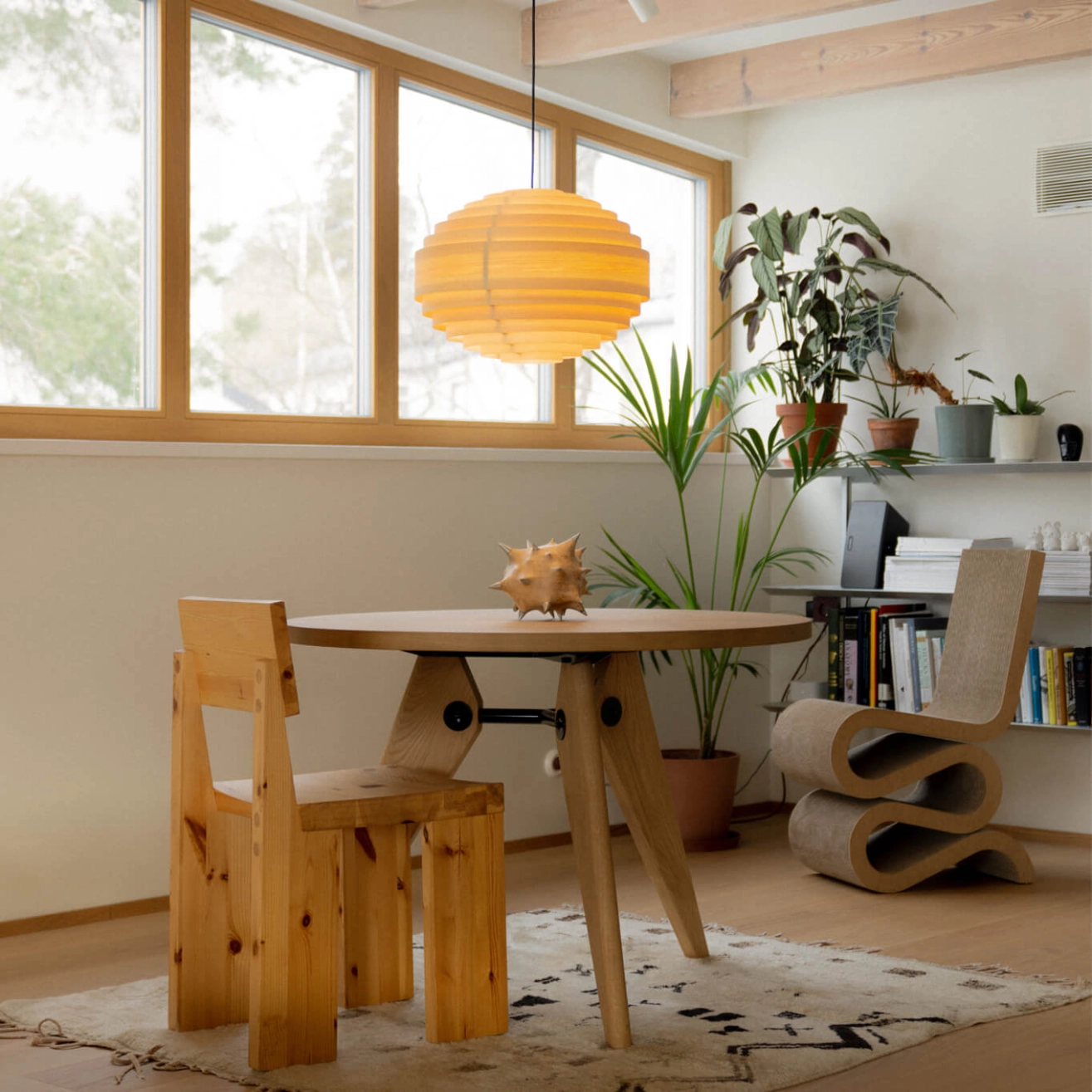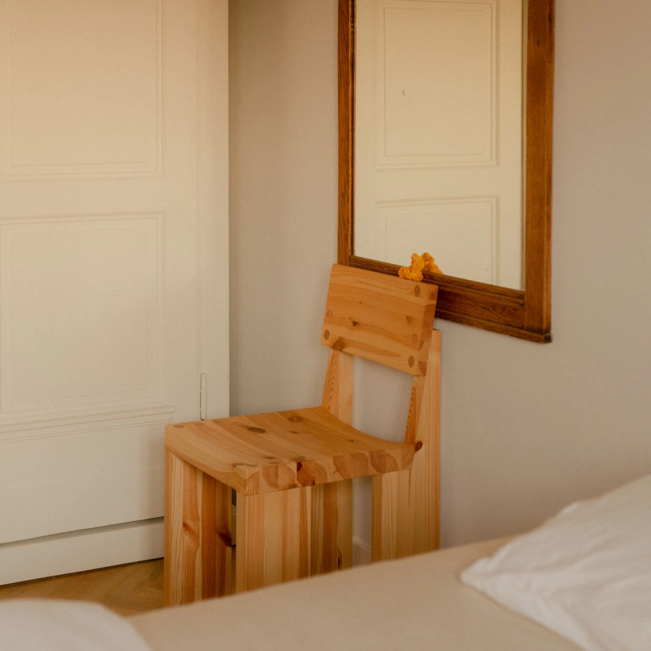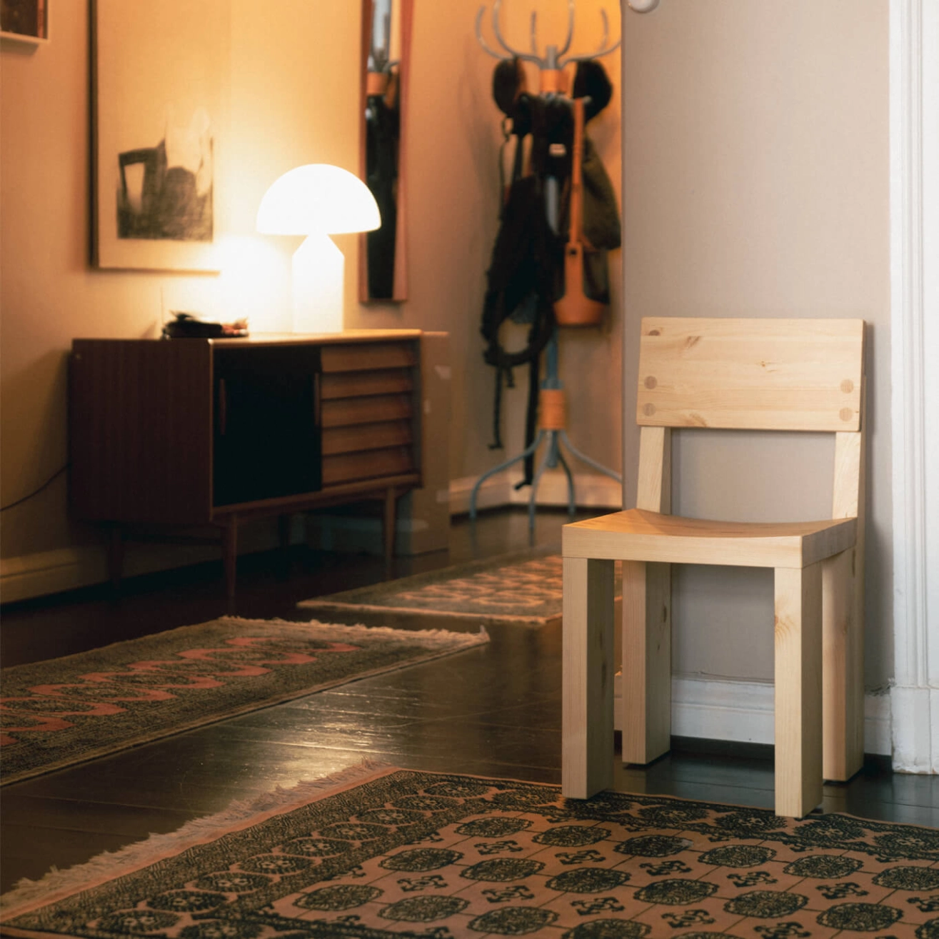 Avec sa silhouette imposante et son caractère affirmé, la chaise 001 de Vaarnii ne passe pas inaperçue. Fredrik Paulsen signe ici une pièce au design robuste, presque sculptural, sans pour autant négliger le confort. Pensée pour les repas qui s’éternisent, la chaise 001 offre une assise accueillante et stable. Le pin finlandais, matériau fétiche du designer, dévoile toute sa richesse graphique à travers les larges surfaces de bois, mettant en valeur ses nuances et son grain vivant. Cette esthétique brute et maîtrisée de la chaise 001 de Vaarnii traduit parfaitement la vision de Paulsen.