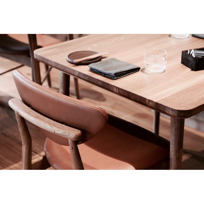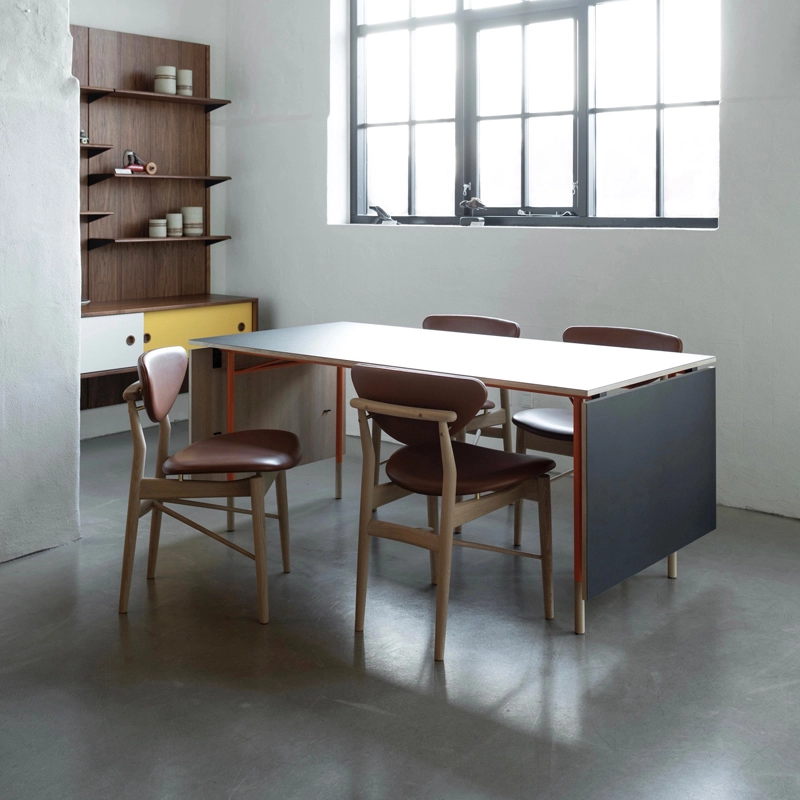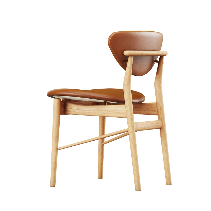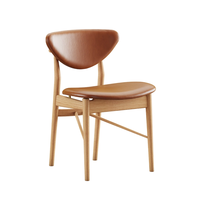 La chaise 108 a été dessinée par Finn Juhl en 1946. En surface, elle ressemble à une chaise ordinaire. Mais après un examen plus poussé, des détails surprenant, comme les barres latérales inclinées, sont révélés. Ces détails apportent un mouvement inattendu et une dynamique à l’ensemble.  A ce jour, les créations de Finn Juhl sont toujours étonnantes et défient les attentes avec des détails subtils. La philosophie de Finn Juhl consistant à séparer les éléments portés et porteurs, créant ainsi de l'espace, est très visible dans la chaise 108. Bien qu’elle soit rembourrée et très confortable, la chaise 108 parvient à garder sa légèreté et sa beauté sous tous les angles.  Fabriquée en chêne ou noyer avec un revêtement en cuir ou en tissu, la chaise 108 s’intègre magnifiquement dans toutes les salles à manger, apportant une touche sophistiquée.
