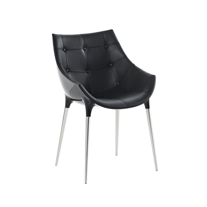 Dessinée par Philippe Starck, Passion est un petit fauteuil qui s'impose par son grand confort et ses lignes douces et accueillantes. La coque en nylon brillant est capitonnée à l'intérieur et revêtue de cuir, ce qui la rend à la fois très confortable et durable dans le temps. Les quatre pieds en acier chromé de forme conique, complètent parfaitement le siège et créent une silhouette légère. Editée par Cassina, la chaise à accoudoirs Passion s'adapte à toutes les ambiances et amène une touche d'élégance subtile et confortable. Elle peut être associée à la chaise Caprice de la même série.