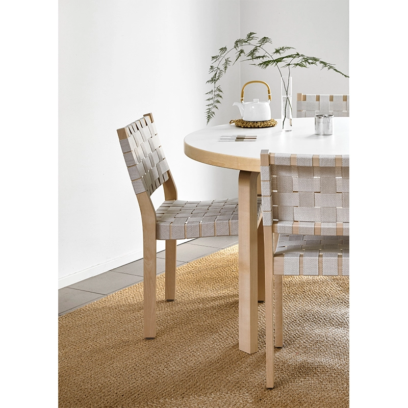 La chaise 611 rassemble une structure en bouleau massif avec une assise et un dossier fait de sangles en lin tressées. Conçue pour offrir confort et praticité, la sangle s'adapte à la personne assise, rendant la chaise exceptionnellement confortable. La chaise 611 peut être facilement retapissée, ce qui signifie que la chaise peut avoir plusieurs cycles de vie. L'une des premières conceptions de meubles modernes d'Alvar Aalto, la chaise 611 est en production continue depuis sa création. S'adaptant à presque tous les environnements, la chaise 611, éditée par Artek, s'empile jusqu'à cinq chaises.