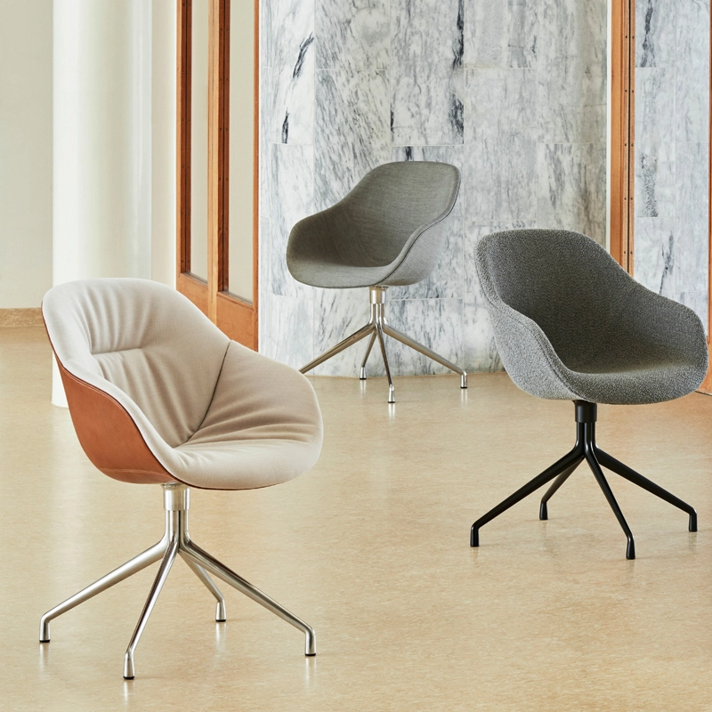 Hay joue sur le contraste entre l'expression formelle de la base pivotante et la douceur de la coque matelassée. Tout en conservant le dossier haut et l'assise généreuse qui caractérisent la série, ce design se démarque par une base fonctionnelle avec des pieds qui s'écartent en éventail du centre. La base en aluminium est associée à une coque disponible dans une variété d'options de rembourrage, offrant une multitude de combinaisons de design qui donnent à cette série sa polyvalence.