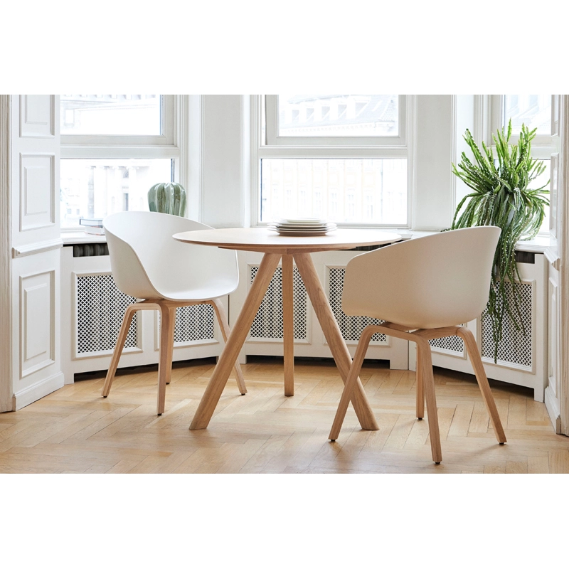 L'idée derrière la collection About A Chair, dessinée par Hee Welling, est de développer une chaise dotée d'une simplicité évidente. Un design sobre et épuré pour cette chaise qui fonctionne aussi bien autour d'une table de salle à manger qu'une table de conférence, dans une cantine ou dans un bureau. L'ambition du designer est de combiner à la fois la forme, la fonction, le détail et l'esthétique. La maison danoise Hay édite cette collection qui présente une large gamme de couleurs et de structures. Ici, la coque en polypropylène repose sur un piètement en bois. Disponible en version chaise ou petit fauteuil, About A Chair assure un confort optimal grâce à sa coque enveloppante à la forme ergonomique. Une chaise qui symbolise parfaitement la pureté, la sobriété et le style intemporel du design scandinave.