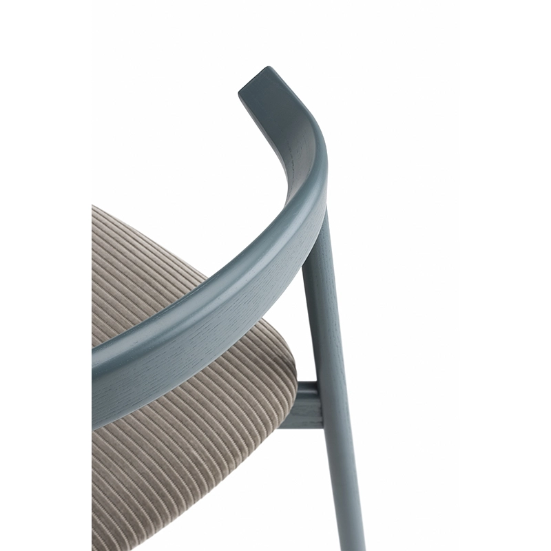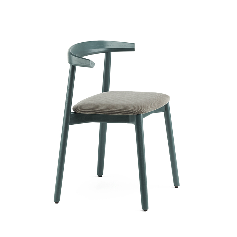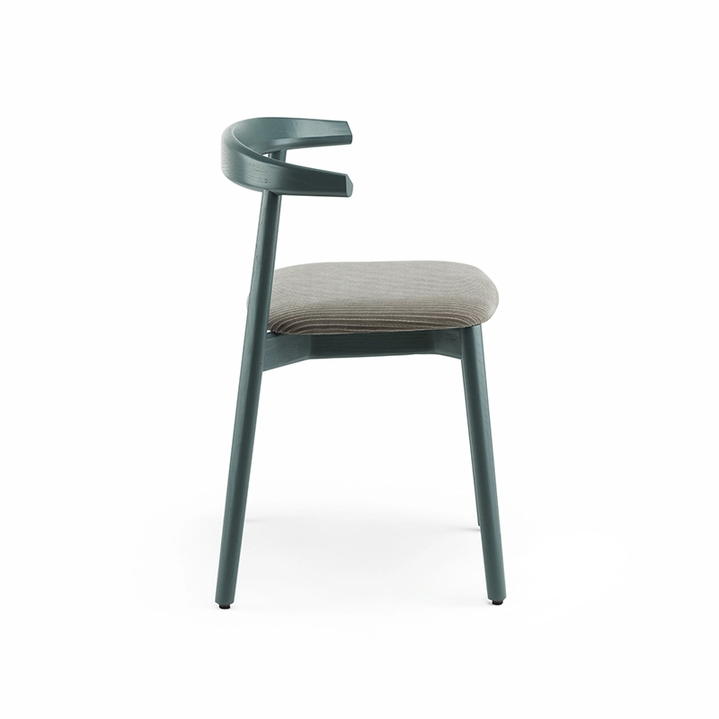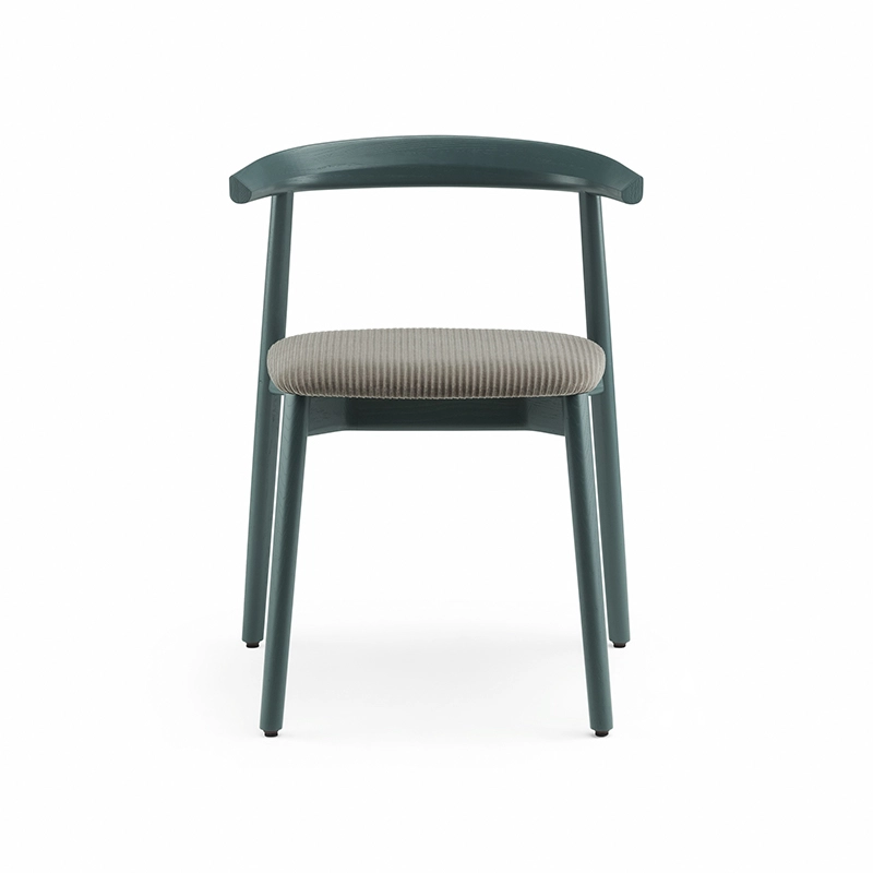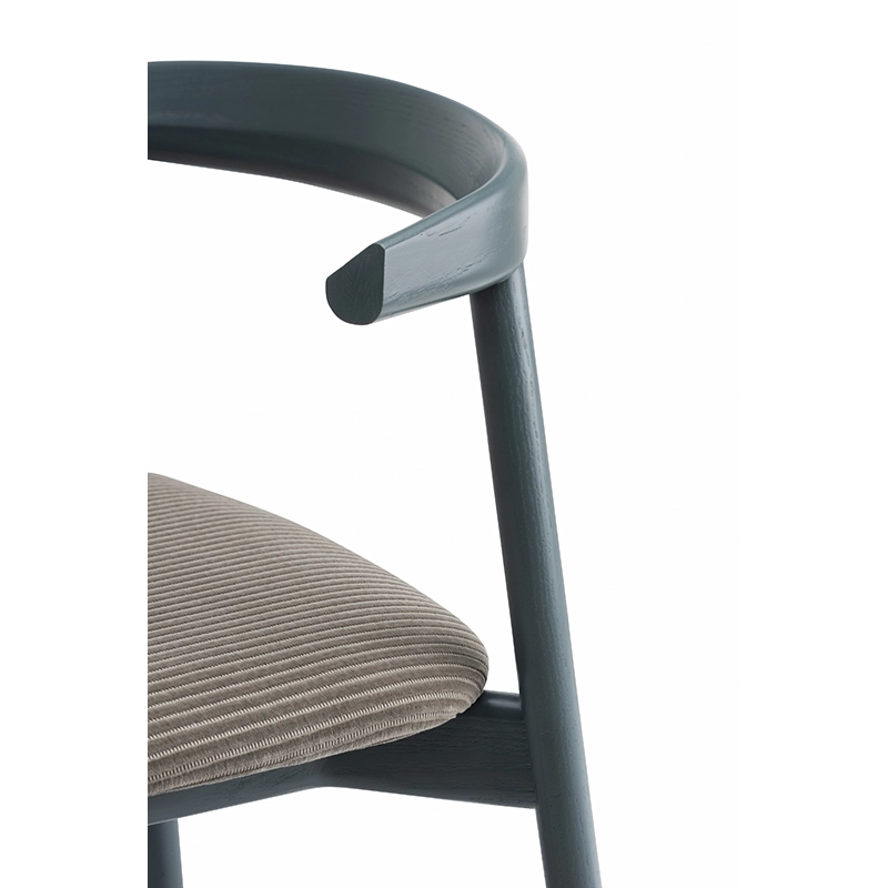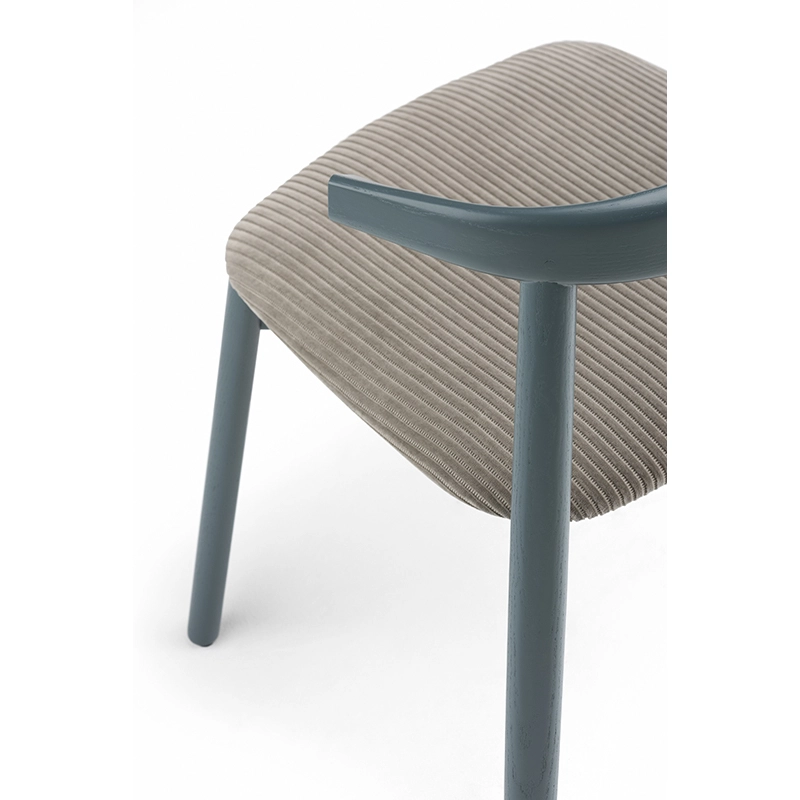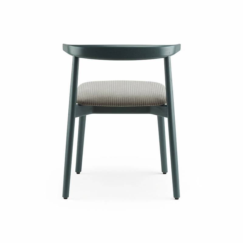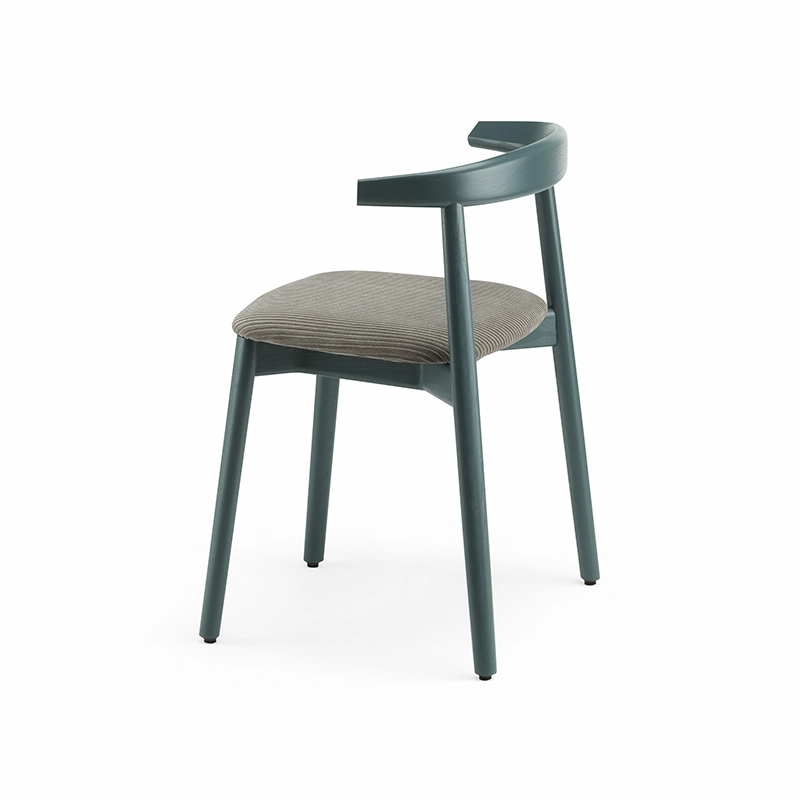 La chaise rembourrée Ando de De La Espada est une conception utilitaire, robuste et silencieuse avec de beaux détails. C'est une chaise de salle à manger relativement compacte avec de la force et de la personnalité tout en restant sobre. Le dos est composé de plusieurs pièces de bois, jointes et sculptées, mettant en valeur les variations naturelles du grain du matériau. L'assise est adoucie par le rembourrage pour plus de confort.