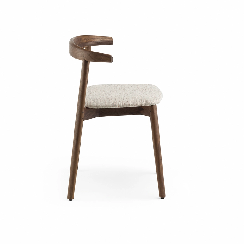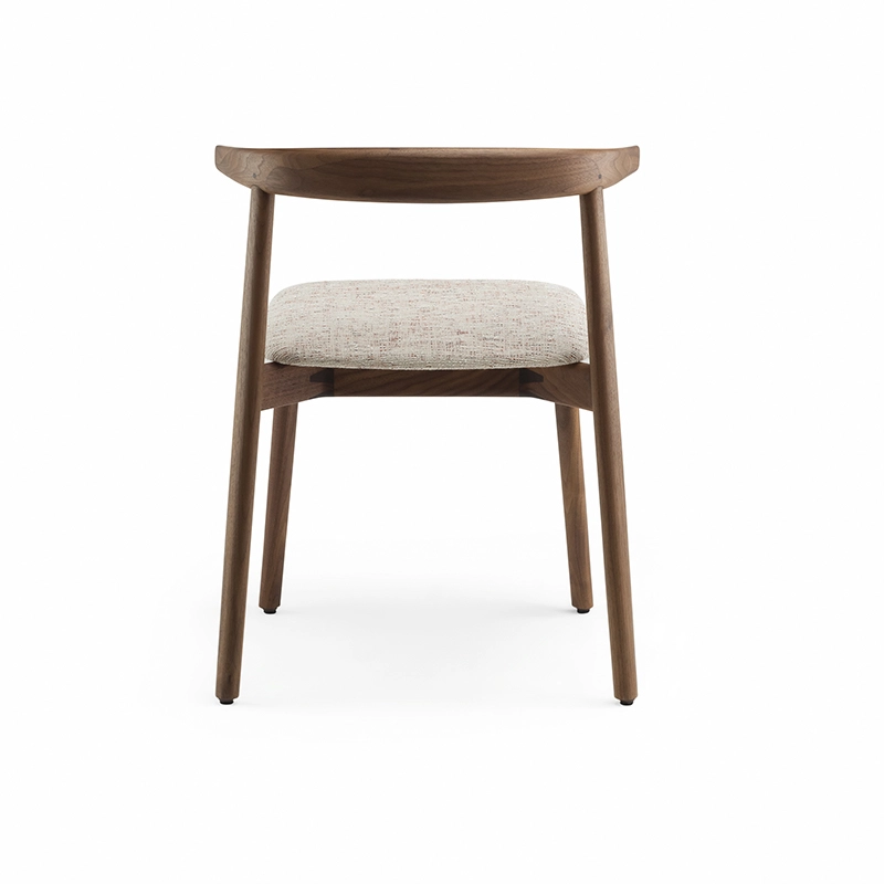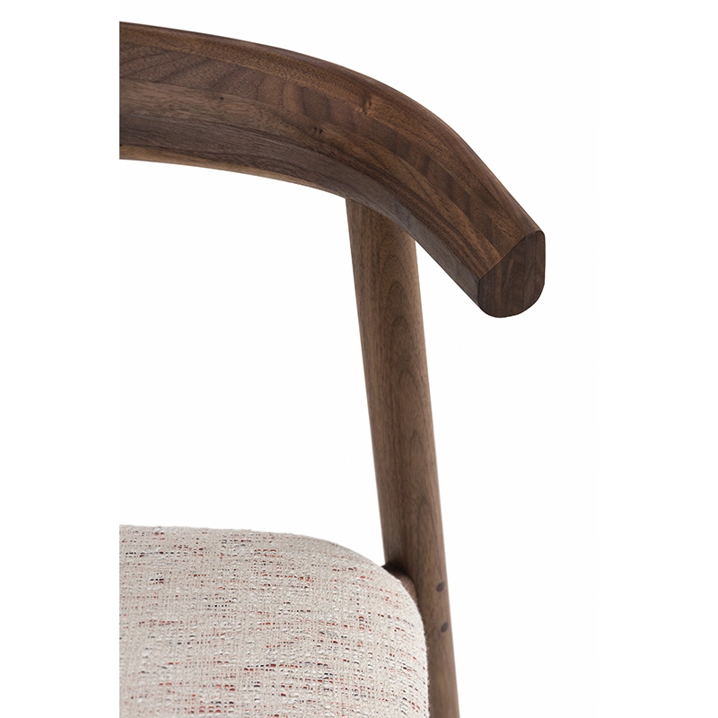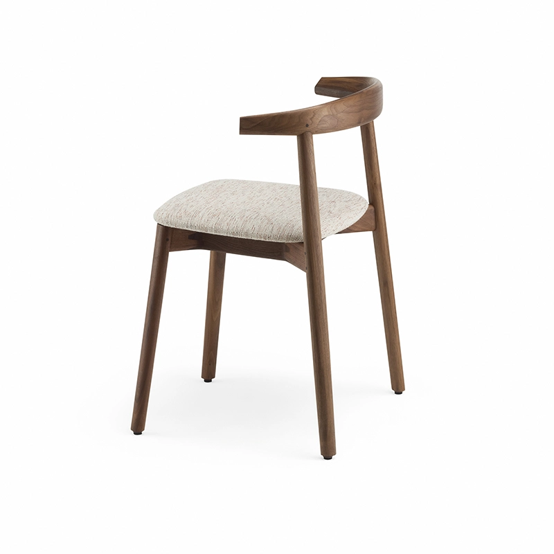 La chaise rembourrée Ando de De La Espada est une conception utilitaire, robuste et silencieuse avec de beaux détails. C'est une chaise de salle à manger relativement compacte avec de la force et de la personnalité tout en restant sobre. Le dos est composé de plusieurs pièces de bois, jointes et sculptées, mettant en valeur les variations naturelles du grain du matériau. L'assise est adoucie par le rembourrage pour plus de confort.