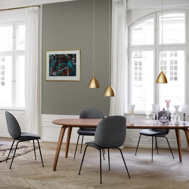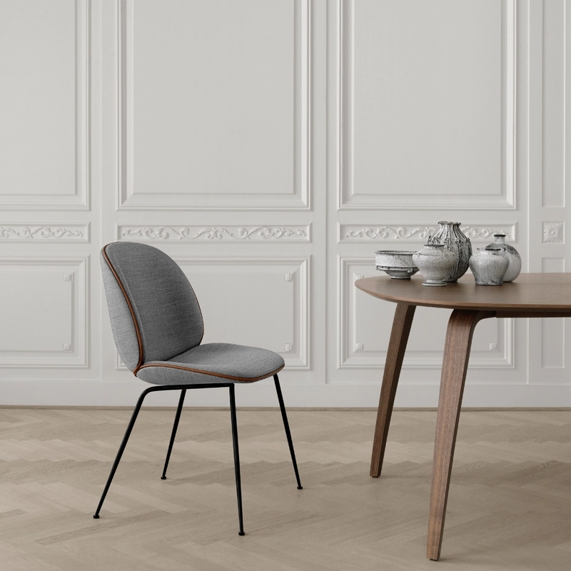 Pour la collection Beetle, la danoise Stine Gam et l’italien Enrico Fratesti se sont inspirés du scarabée, en étudiant l’anatomie, l’esthétique et le mouvement de l’insecte. La chaise Beetle a rencontré son public dès son introduction en 2013 et est devenue depuis le plus grand succès commercial de Gubi. Ainsi la collection réinterprète les éléments caractéristiques du scarabée que ce soit par la forme, les jointures, l’aspect rigide à l’extérieur et souple à l’intérieur. La chaise Bettle est un mélange entre le design classique italien et les traditions scandinaves. Les créations du studio jouent souvent avec l’héritage du design classique danois, mais aussi avec la nature et plus particulièrement le monde des insectes, puisque la Beetle leur a été inspirée par la carapace des scarabées. Le siège et le dossier sont réalisés en contreplaqué moulé, recouverts de tissu et rembourrés pour assurer un confort optimal. Les pieds, de forme légèrement conique, sont en acier recouverts à l'époxy noir ou en laiton. Gubi propose une chaise dont l'élégance de la forme du siège est soulignée par un passepoil en cuir. Les créations du studio GamFratesi incarnent l'union du design italien avec la sobriété danoise. Les contrastes sont souvent la clé de l'inspiration de ce duo qui travaille avec une approche artisanale purement scandinave, simple et fonctionnelle, mais toujours avec un concept et une histoire forte, intégrés dans chacune de leur création. Ultra confortable, la chaise Beetle trouve sa place dans différents environnements : autour d’une table de repas, devant un bureau, à la maison ou sur un lieu de travail. Son design attrayant, son confort exceptionnel et ses vastes possibilités de personnalisation ont séduit les particuliers et les architectes d’intérieur et l’on peut la voir aujourd’hui dans de nombreux restaurants parmi les plus renommés du monde.