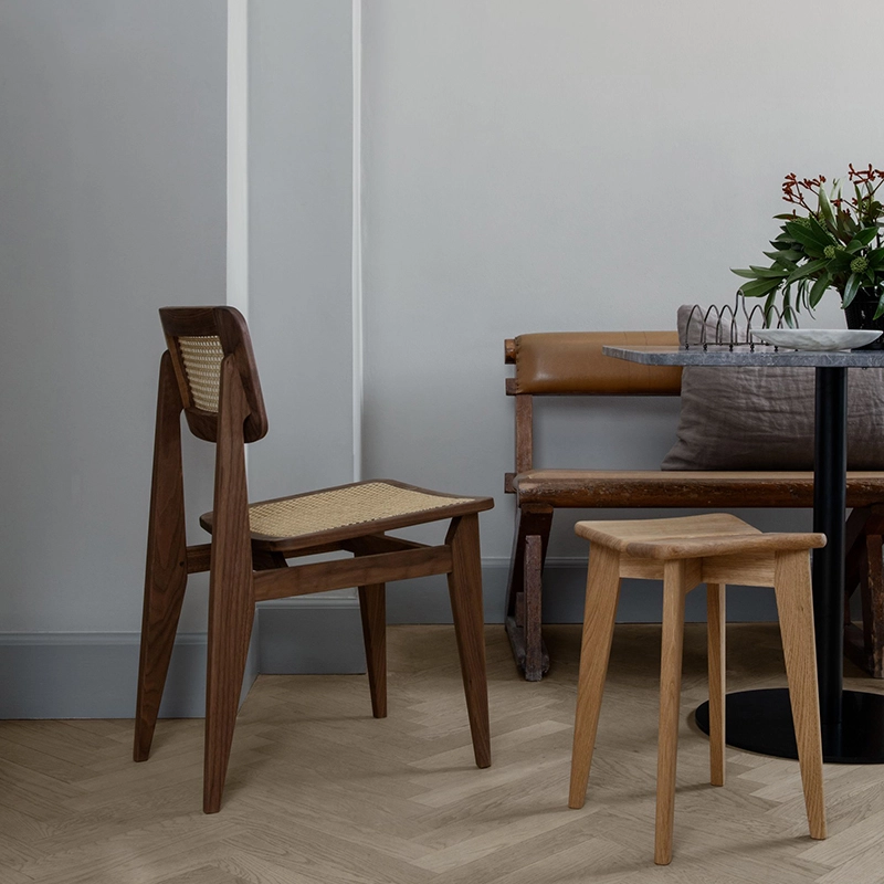 C-Chair a été créée à l'origine par nécessité pour s'adapter aux nouvelles dimensions des maisons construites à la fin de la Seconde Guerre mondiale, où Gascoin a comblé le manque d'espace en créant des meubles simples et fonctionnels. Intelligemment conçue avec beaucoup d'attention aux détails, la