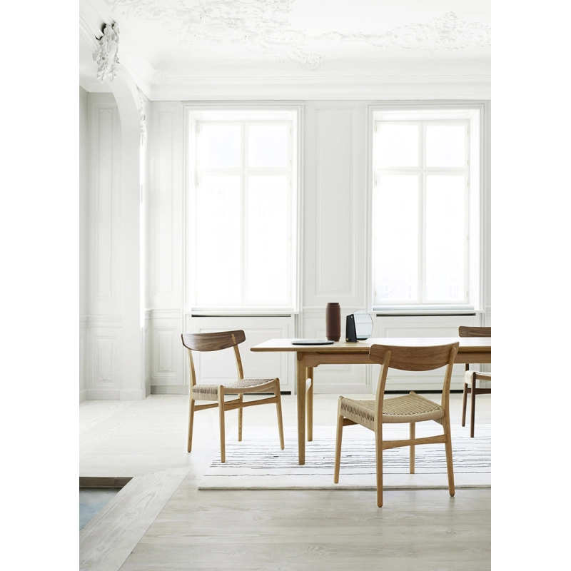La chaise de repas CH23 a été conçue exclusivement par Hans J. Wegner pour Carl Hansen & Søn en 1950. Les pièces qu'il a créées à cette époque étaient non seulement uniques, mais ont également établi de nouvelles normes pour la conception de meubles modernes avec leur expression artistique et leur ergonomie. Simple à première vue, la chaise CH23 intègre de nombreux détails raffinés et sophistiqués, parmi lesquels les élégants capuchons du dossier, une assise à double tissage et des pieds arrière arqués qui assurent une stabilité optimale. En 2017 Carl Hansen & Søn donne une nouvelle vie à la CH23, voulant réintégrer à sa collection les premières pièces iconiques. Comme toujours, la conception reste fidèle aux croquis originaux dessinés à la main de Wegner, avec tous les composants esthétiques et structurels intacts.