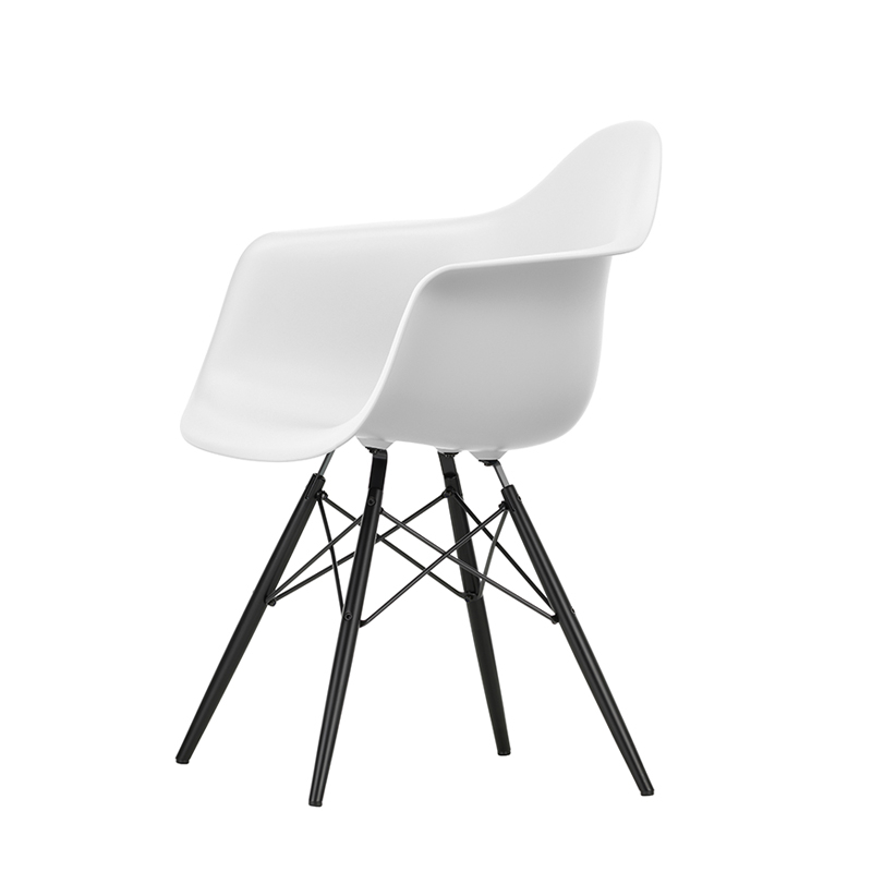 Les Plastic Armchairs dessinés par Charles et Ray Eames dans les années 50 ont été présentés pour la première fois dans le cadre du concours « Low Cost Furniture Design » organisé par le Museum of Modern Art de New York. La Eames Plastic DAW (Dinig Armchair Wooden base) possède une coque aux lignes organiques qui était à l'origine en fibre de verre. Rééditée par Vitra avec une coque en polypropylène, elle offre toujours un grand confort à un prix accessible. Le piètement est composé de quatre pieds en érable teinté et laqué avec des croisillons en tube d'acier. C'est un petit fauteuil idéal pour des repas qui se prolongent.