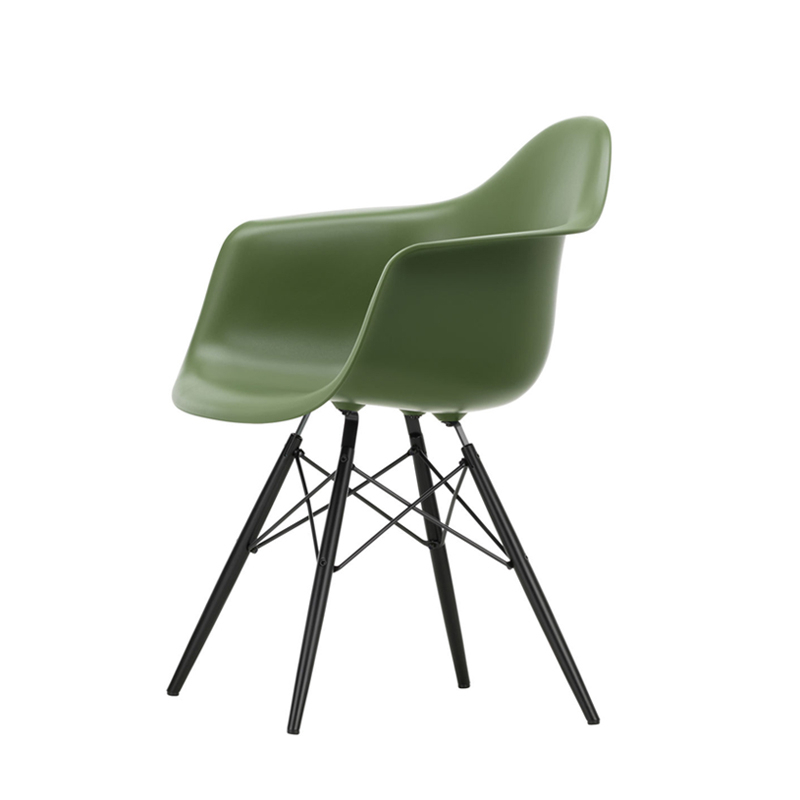 Les Plastic Armchairs dessinés par Charles et Ray Eames dans les années 50 ont été présentés pour la première fois dans le cadre du concours « Low Cost Furniture Design » organisé par le Museum of Modern Art de New York. La Eames Plastic DAW (Dinig Armchair Wooden base) possède une coque aux lignes organiques qui était à l'origine en fibre de verre. Rééditée par Vitra avec une coque en polypropylène, elle offre toujours un grand confort à un prix accessible. Le piètement est composé de quatre pieds en érable teinté et laqué avec des croisillons en tube d'acier. C'est un petit fauteuil idéal pour des repas qui se prolongent.