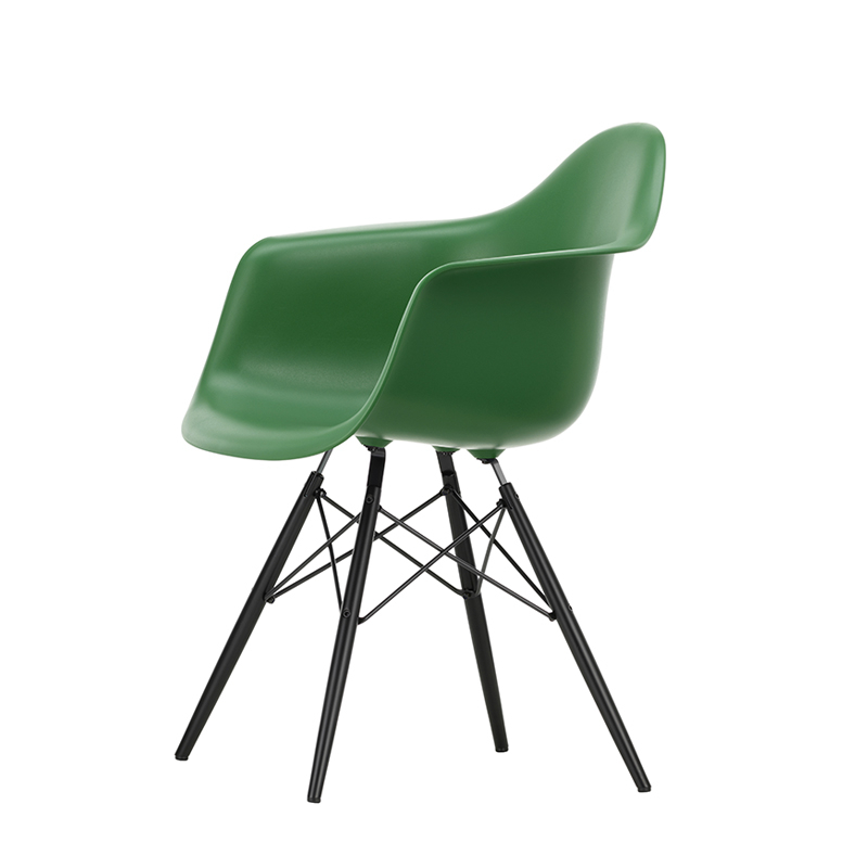 Les Plastic Armchairs dessinés par Charles et Ray Eames dans les années 50 ont été présentés pour la première fois dans le cadre du concours « Low Cost Furniture Design » organisé par le Museum of Modern Art de New York. La Eames Plastic DAW (Dinig Armchair Wooden base) possède une coque aux lignes organiques qui était à l'origine en fibre de verre. Rééditée par Vitra avec une coque en polypropylène, elle offre toujours un grand confort à un prix accessible. Le piètement est composé de quatre pieds en érable teinté et laqué avec des croisillons en tube d'acier. C'est un petit fauteuil idéal pour des repas qui se prolongent.