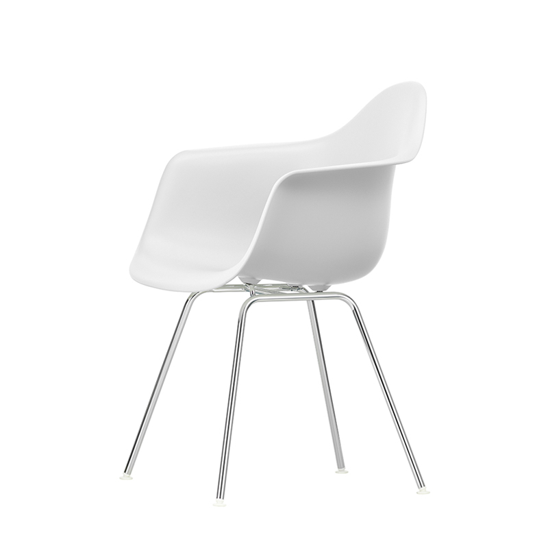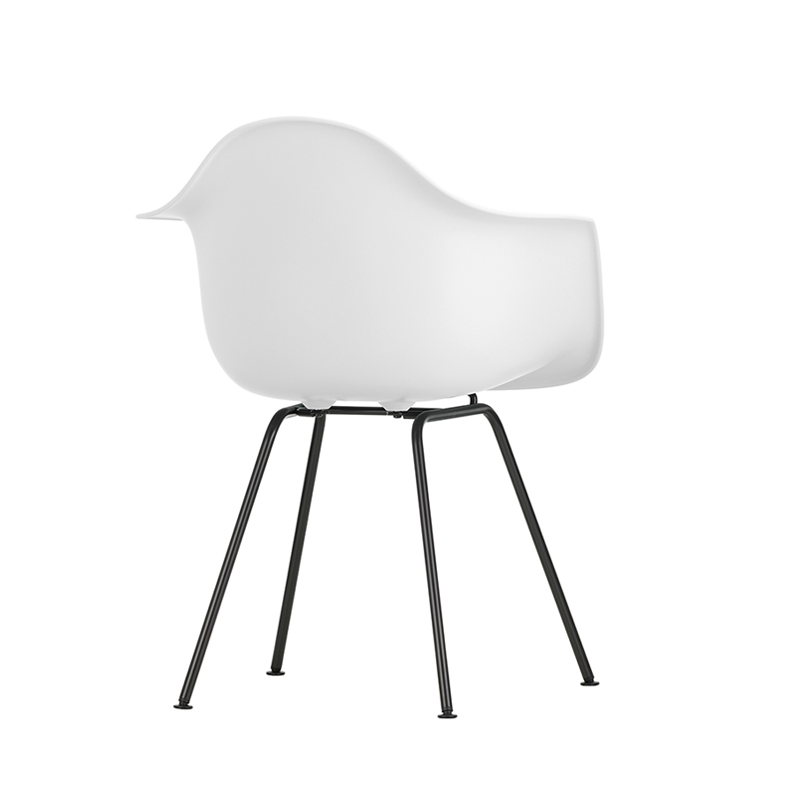 Eames Plastic DAX (Dining Height Armchair X-Base) est dotée d'un piètement à quatre pieds en tube d'acier, à l'apparence discrète, disponible en finition époxy qui convient également aux utilisations extérieures. C'est un petit fauteuil qui s'adapte aussi bien aux espaces domestiques qu'aux environnements collectifs.