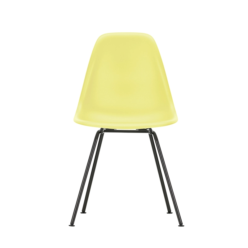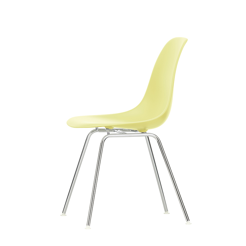 Les Plastic Armchairs dessinés par Charles et Ray Eames dans les années 50 ont été présentés pour la première fois dans le cadre du concours « Low Cost Furniture Design » organisé par le Museum of Modern Art de New York. La coque aux lignes organiques était à l'origine en fibre de verre. Rééditée par Vitra avec une coque en polypropylène, La chaise DSX (Dining Height Side Chair X-Base) à l'esthétique sobre se définit par un piètement à quatre pieds en tube d'acier et une coque aux formes organiques disponible en une large palette de couleurs. Le piètement se décline en version chromée ou finition époxy noir qui est adapté aussi à une utilisation à l'extérieur. La chaise DSX s'adapte aussi bien aux espaces domestiques qu'aux environnements collectifs. En adoptant le polypropylène moulé, Vitra en a amélioré à la fois la robustesse, l'élasticité et le confort. À partir d'une unique forme de coque, la chaise est déclinée en trois grandes familles caractérisées par la forme du piètement : la chaise Eames DSR avec piètement Eiffel, la chaise Eames DSW avec piètement à croisillons de bois et la chaise Eames DSX à piètement tubulaire simple. Les chaises Eames DSXE sont disponibles en plusieurs couleurs, avec ou sans coussin d'assise ou rembourrage intérieur.