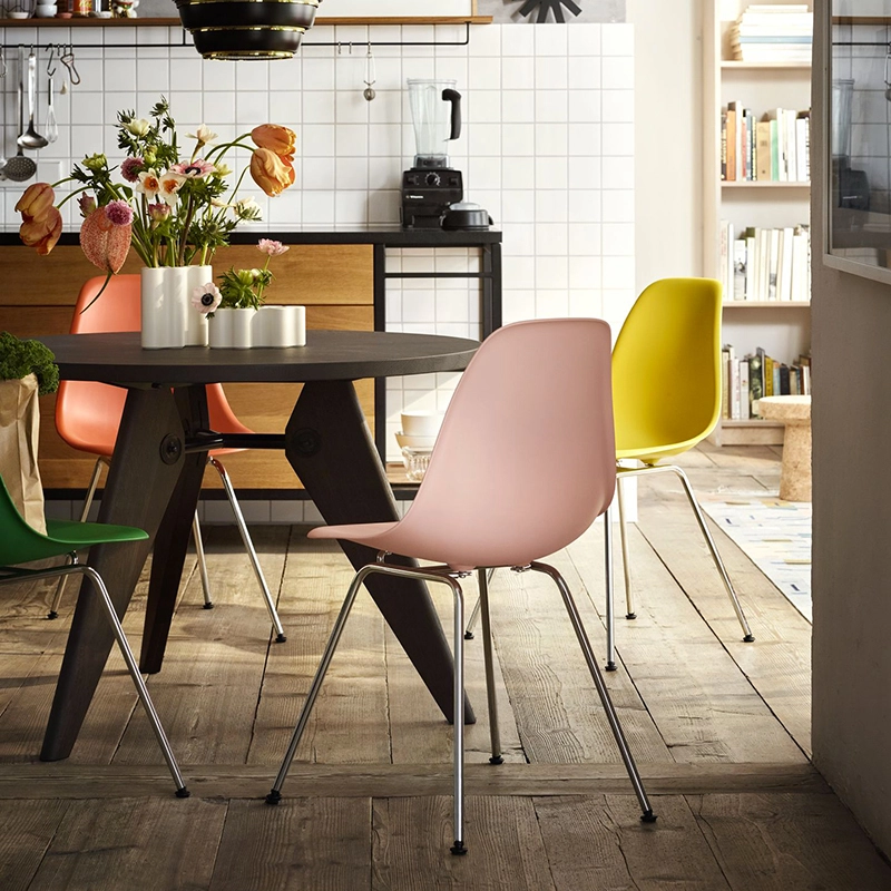 Les Plastic Armchairs dessinés par Charles et Ray Eames dans les années 50 ont été présentés pour la première fois dans le cadre du concours « Low Cost Furniture Design » organisé par le Museum of Modern Art de New York. La coque aux lignes organiques était à l'origine en fibre de verre. Rééditée par Vitra avec une coque en polypropylène, La chaise DSX (Dining Height Side Chair X-Base) à l'esthétique sobre se définit par un piètement à quatre pieds en tube d'acier et une coque aux formes organiques disponible en une large palette de couleurs. Le piètement se décline en version chromée ou finition époxy noir qui est adapté aussi à une utilisation à l'extérieur. La chaise DSX s'adapte aussi bien aux espaces domestiques qu'aux environnements collectifs. En adoptant le polypropylène moulé, Vitra en a amélioré à la fois la robustesse, l'élasticité et le confort. À partir d'une unique forme de coque, la chaise est déclinée en trois grandes familles caractérisées par la forme du piètement : la chaise Eames DSR avec piètement Eiffel, la chaise Eames DSW avec piètement à croisillons de bois et la chaise Eames DSX à piètement tubulaire simple. Les chaises Eames DSXE sont disponibles en plusieurs couleurs, avec ou sans coussin d'assise ou rembourrage intérieur.