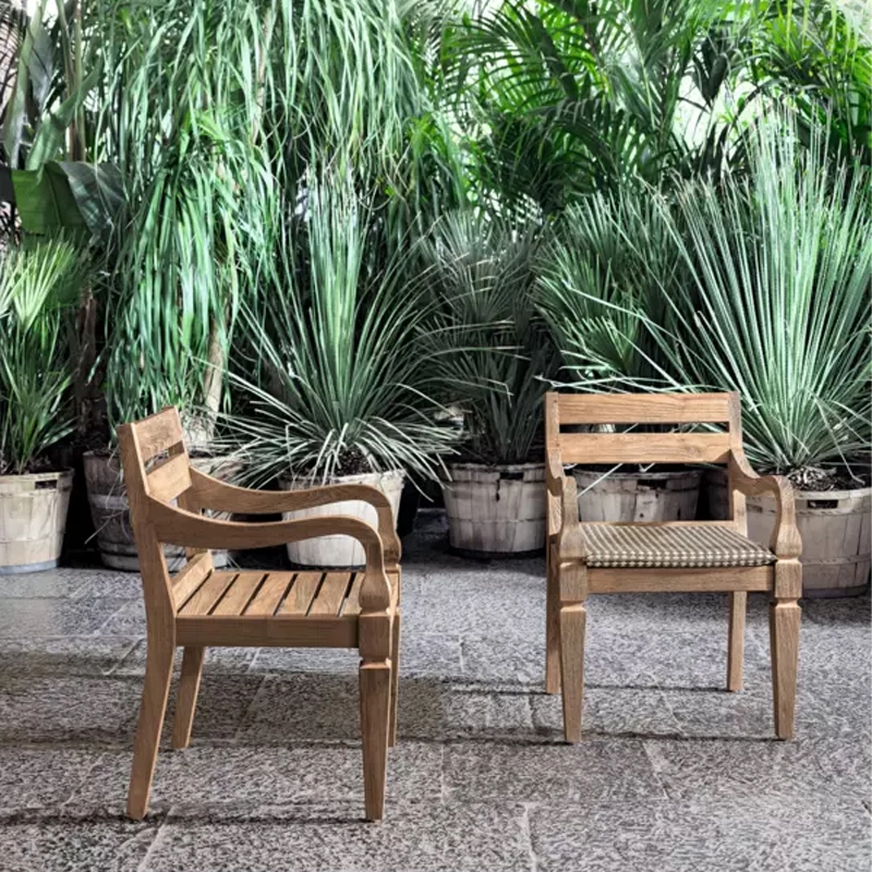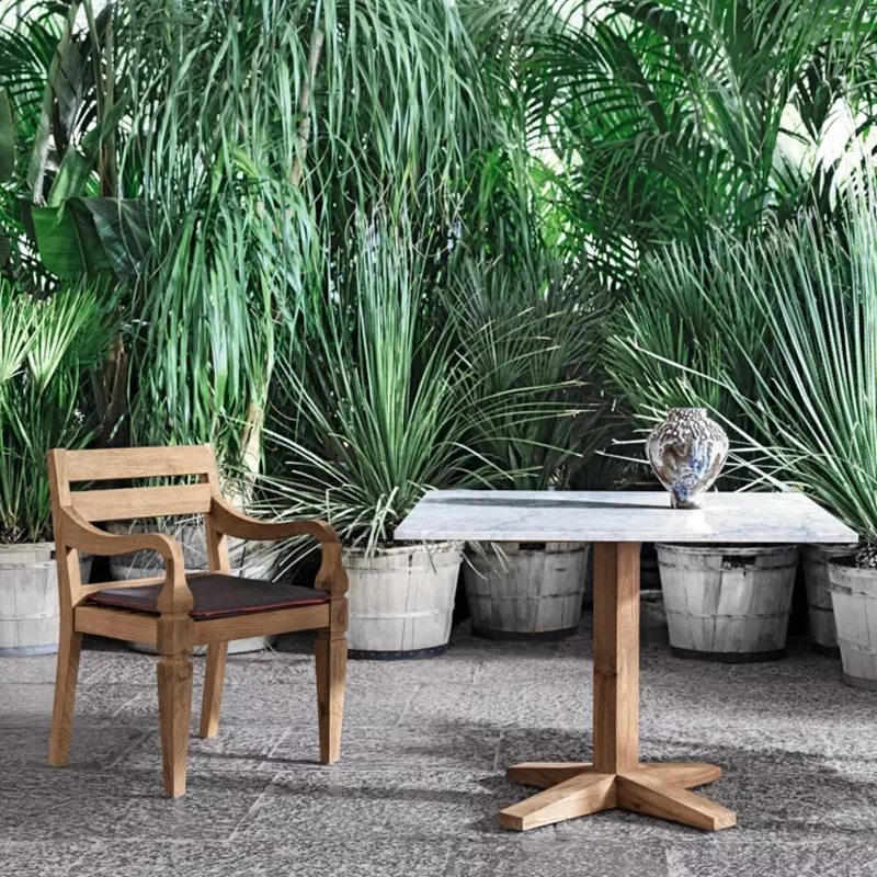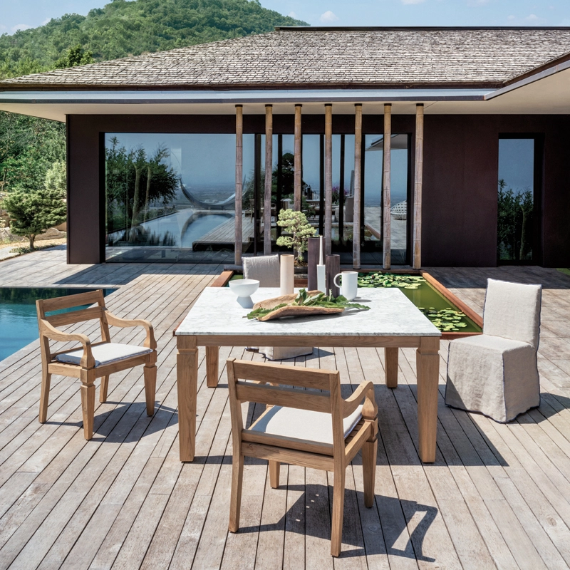 Le petit fauteuil Jeko 24 a été conçu par Paola Navone pour la marque Gervasoni. De style colonial et d’inspiration exotique, le petit fauteuil Jeko 24 possède une structure en éco-teck. Conçu pour résister à l’eau et au soleil, ce matériau provient de la valorisation de poutres et d’éléments de récupération en teck, qui sont réparés avec du bois recyclé, assemblés puis polis afin de mettre en valeur les veines d’origine du bois. Pour plus de confort, il est doté d'un coussin d'assise déhoussable en tissu conçu pour l'extérieur.