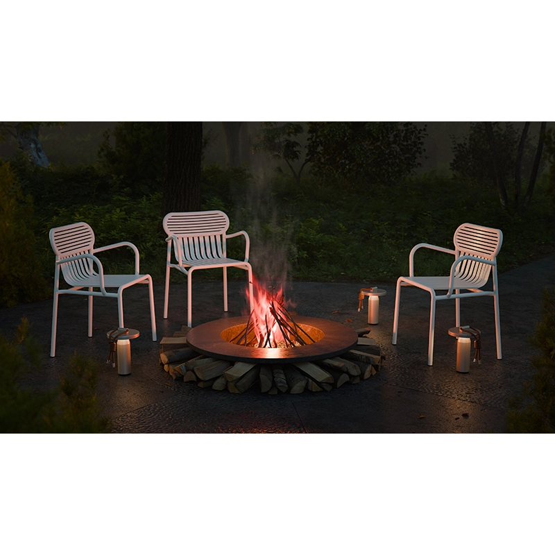 Avec Week-End, la marque française Petite Friture, pose son regard singulier sur l’été et propose avec le Studio Brichet-Ziegler une approche graphique et contemporaine du mobilier de jardin. Celle-ci se joue d’un rythme de bandes horizontales et verticales posées avec habileté sur une structure aux lignes fortes. Les bandes de ce petit fauteuil qui caractérisent la collection Week-End éditée par Petite Friture, sont réalisées dans des feuilles d’aluminium découpées au laser en une seule pièce et non en lattes assemblées, permettent la suppression de vis ou de soudures inconfortables. Le travail des lattes horizontales et verticales comme des rayures, souligne les pleins et les vides, affirmant l’identité de la collection. La collection Week-End est une gamme de mobilier outdoor complète. Les couleurs précises sélectionnées pour cette collection marquent seules ou en combinaison les lignes d’horizon d’un balcon, d’une terrasse ou d’un jardin. Ce petit fauteuil est disponible en plusieurs couleurs comme le noir, jaune, vert jade … La mise en couleurs de la collection Week-end, de Petite Friture, en peinture poudre époxy anti-UV grainée garantit un maintien impeccable des teintes au cours du temps. Le petit fauteuil design Week-End proposé par Petite Friture a été conçu avec l’obsession de tirer le meilleur parti des matériaux et des techniques de réalisation à la disposition des designers. Réalisée en aluminium, matériau sélectionné pour sa légèreté et sa résistance aux intempéries, la collection Week-End allie confort esthétique et sens pratique. En effet, cette collection est résolument pensée autour d’une utilisation pratique car toutes les assises sont empilables.