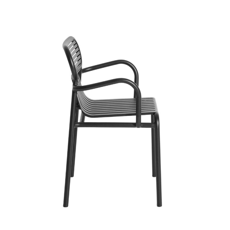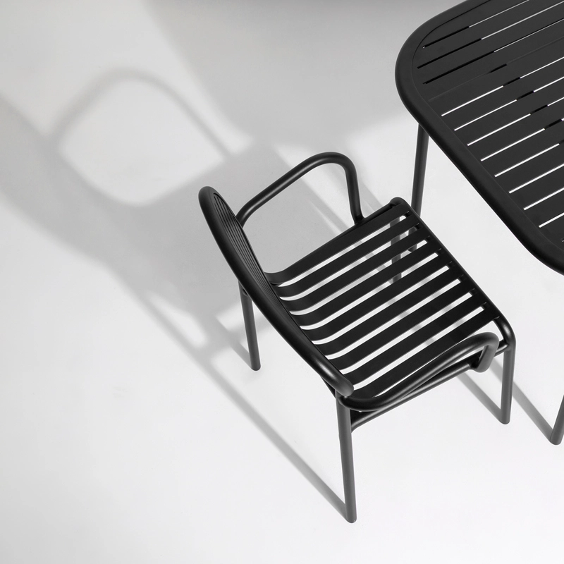 Petite Friture, sont réalisées dans des feuilles d’aluminium découpées au laser en une seule pièce et non en lattes assemblées, permettent la suppression de vis ou de soudures inconfortables. Le travail des lattes horizontales et verticales comme des rayures, souligne les pleins et les vides, affirmant l’identité de la collection. La