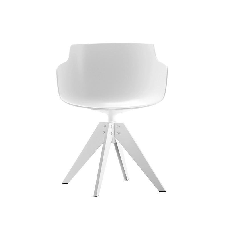 Flow est une famille de chaises confortables, à la silhouette élégante, dessinée par Jean-Marie Massaud pour MDF. Le designer s'est inspiré de classiques du design comme la Plastic Chair de Eames pour développer cette assise en polycarbonate moulé, qui s'associe à différents piétements. La collection Flow s'adapte aussi bien à un usage domestique, dans la cuisine, la salle à manger, que dans des espaces collectifs, comme des bureaux. La coque possède une finition brillante à l'extérieur et gaufrée à l'intérieur. La base quatre pieds en acier VN est laqué de la même couleur que la coque, blanche ou noire. Le siège pivote à 360°.