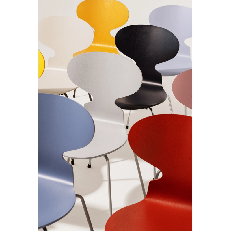 La chaise Fourmi d'Arne Jacobsen est une icône qui ressemble un peu à la forme d'une fourmi avec la tête levée. Sa forme élancée masque sa force.Initialement, Arne Jacobsen dessina les chaises Fourmi pour la cantine du Novo Nordic, un laboratoire pharmaceutique Danois en 1952. Aujourd'hui la chaise Fourmi est une des icônes dominantes de la collection Fritz Hansen. Bien que les formes soient minimalistes, la Fourmi est une chaise extrêmement confortable. C'est une chaise empilable réalisée en bois de chêne et montée sur un piétement à quatre pieds en tube d'acier inoxydable satiné. La coque est faite de placage moulé sous pression - sept couches de placage intérieur et deux couches de placage extérieur, à l'avant et à l'arrière de la coque. Le placage intérieur est en hêtre.