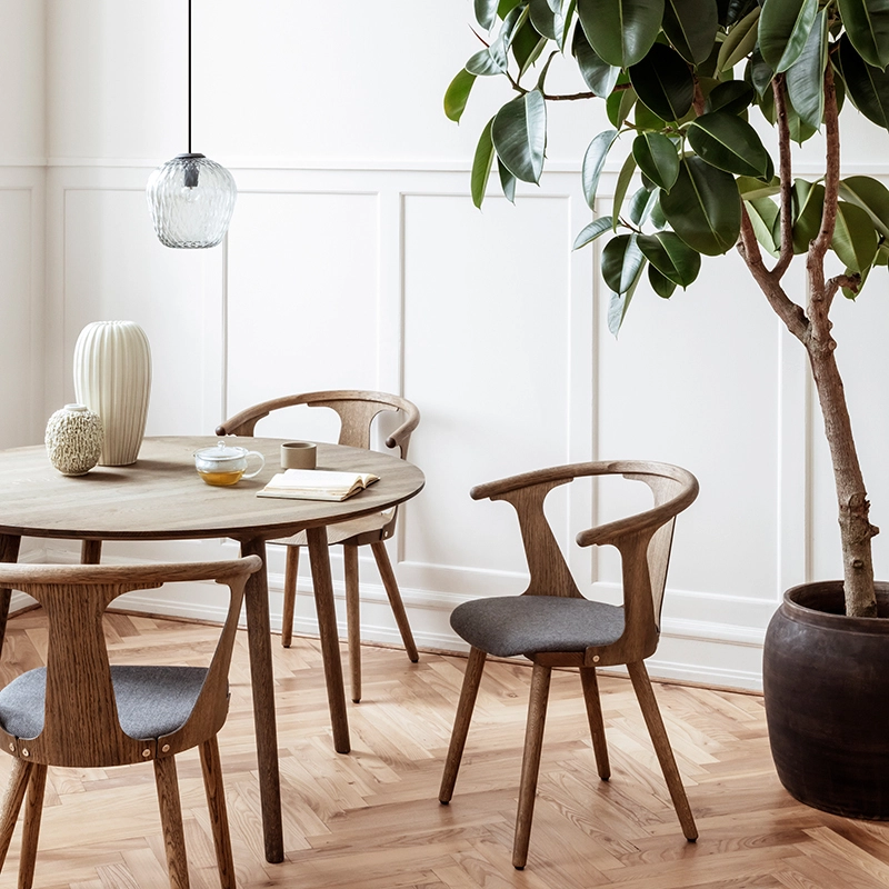 Pour And Tradition, le designer Sami Kallio dessine In Between, une chaise dont le point central est le jeu entre l'espace positif et négatif. Le dossier et les côtés assurent une forme stable et un bon soutien, mais les formes sont également créées par les espaces vides. Le dossier et l'assise légèrement en pente sont équilibrés par les pieds aux formes dynamiques, faisant du petit fauteuil In Between un classique du design contemporain qui s'intègre dans tous les intérieurs. Ce petit fauteuil est un manifeste du savoir-faire du designer et du travail artisanal du bois. La production de la chaise nécessite des procédés industriels modernes et des interventions manuelles, créant une harmonie entre innovation et tradition. L'assise en cuir ou en tissu apporte une touche de confort et d'élégance en plus.