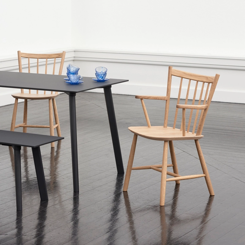 Le petit fauteuil J42, dessiné par Børge Mogensen et réédité par Hay, est doté d'accoudoirs, d’un dossier légèrement incliné et de tiges largement espacées créant un design épuré qui offre une qualité intemporelle. La chaise à accoudoirs J42 combine aspect chaleureux naturel, confort et durabilité. Elle est disponible en hêtre naturel, en hêtre laqué dans différentes couleurs, en chêne laqué naturel ou chêne huilé. La chaise J41 Hay s'intègre à tous les styles d'espaces aussi bien dans la cuisine que dans le salle à manger.