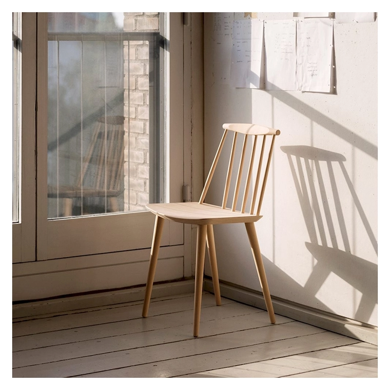 La chaise J77, réalisée par Poul M. Vother, fait partie de la collection rééditée par Hay des classiques du mobilier danois conçus à l'origine pour la société de coopérative des consommateurs danois FDB : des icones dessinées par de grands designers danois dans les années 50-60 . L'idée première, dans les années 40, était de créer du mobilier fonctionnel et démocratique, accessible à tous. En produisant de façon industrielle et ainsi en réduisant les coûts, FDB améliore la disponibilité du mobilier de designer pour les gens ordinaires, en proposant un design de grande qualité à des prix relativement bas. La chaise J77 Hay, dessinée par Folke Palsson est fabriquée en hêtre et disponible en finition naturelle ou peinte. J77 est une chaise représentant à merveille le design scandinave vintage avec ses lignes pures, sobres et rétro. Le designer reprend le dossier formé de fines baguettes en bois, si caractéristique de la chaise Windsor, très en vogue au 18è siècle, pour former une structure aérienne et graphique, avec une assise très confortable. La chaise J77 Hay s'intègrera à tous les espaces de votre intérieur et apportera une touche vintage très tendance autour de votre table.