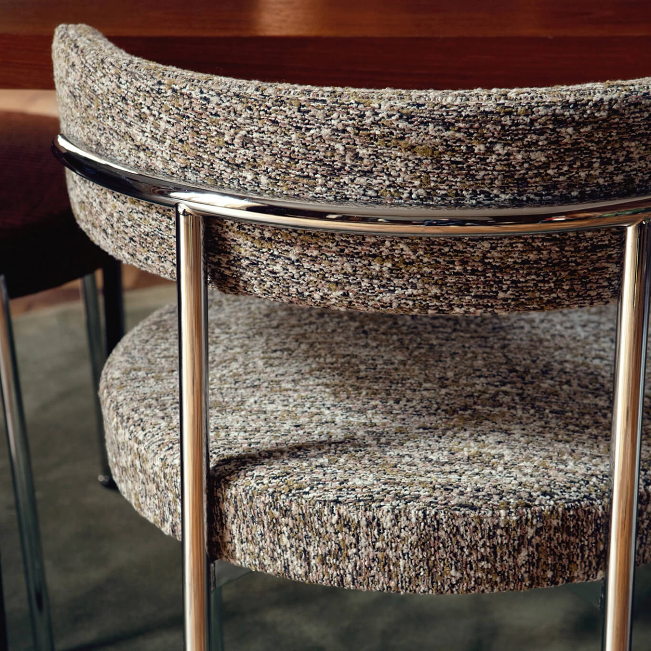 Son piètement en métal chromé, aux lignes fines et graphiques, apporte une légèreté visuelle et un contraste subtil avec la profondeur du tissu. Cette combinaison de matériaux nobles illustre un design équilibré, où le confort se marie à une esthétique moderne et lumineuse.