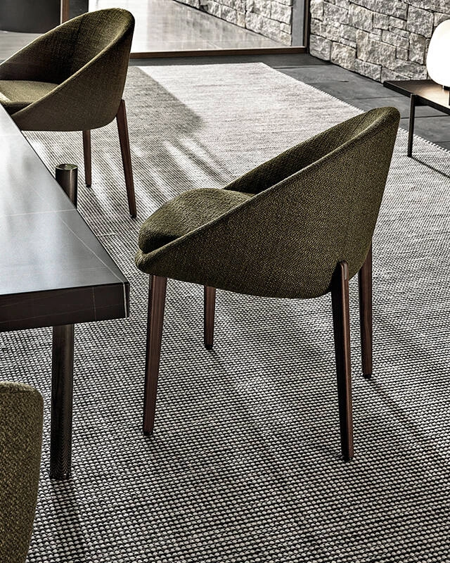 Signé par le duo italo-danois GamFratesi pour Minotti, le fauteuil Lido se présente comme un nid confortable en forme de panier agrémenté d’une assise ronde. Inspiré des années 50, Lido se caractérise par des lignes courbes continues et enveloppantes évoquant les éléments stylistiques de l’architecture brutaliste. Un très bel insert décoratif en acier peint Bronze orne la partie supérieure des pieds, marquant ainsi avec élégance leur jonction avec la structure.