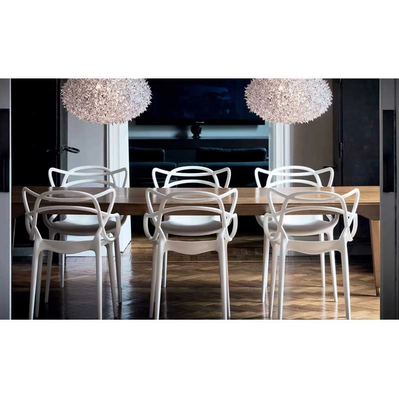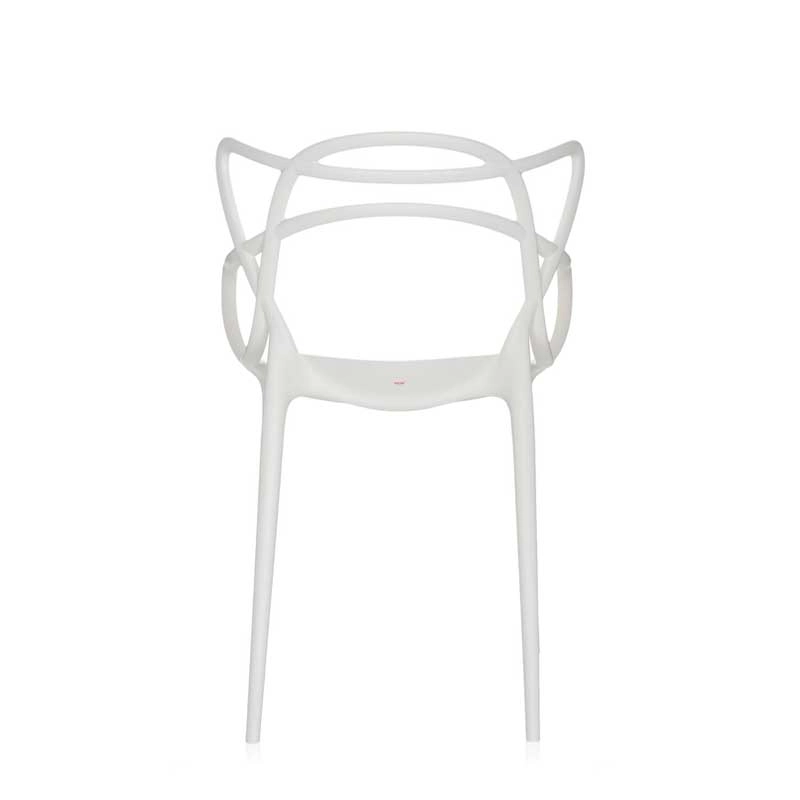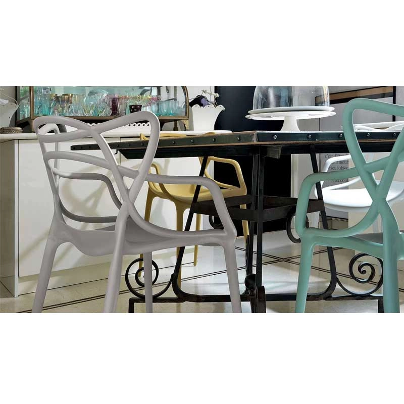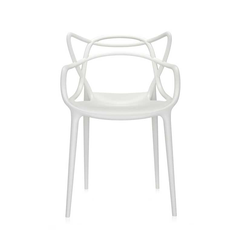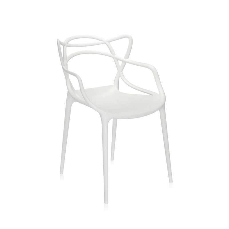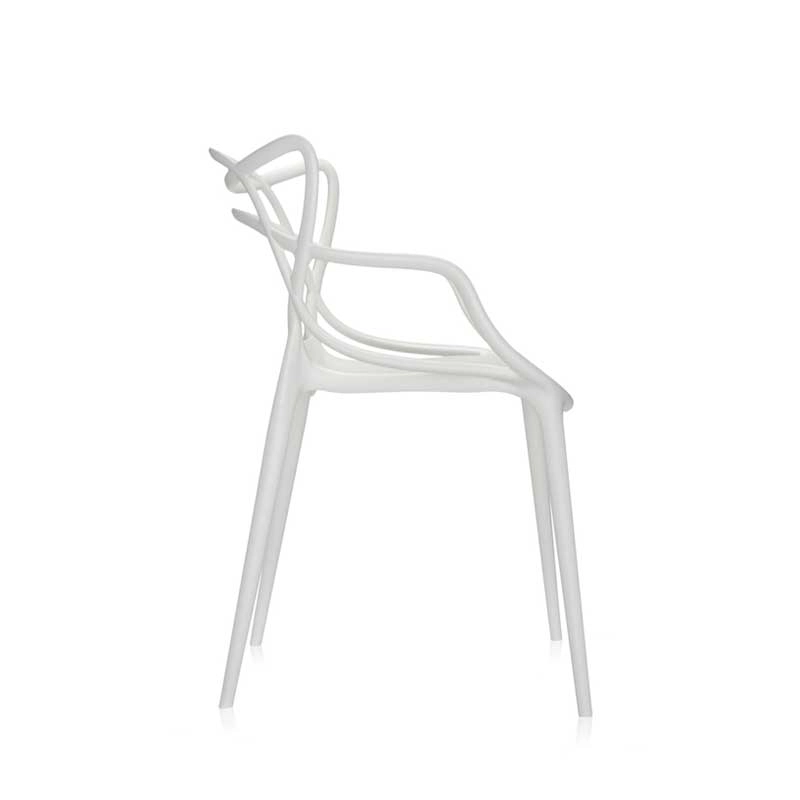 Les designers Philippe Starck et Eugeni Quitllet rendent hommage à trois icônes du design contemporain et donne vie à une fusion de styles pour obtenir une "synthèse stylistique". En effet, l’entrelacement de lignes sinueuses et dynamiques sur le dossier de la chaise Masters, évoque les silhouettes de trois classiques du design contemporain : la Série 7 d'Arne Jacobsen, la Tulip Armchair d'Eero Saarinen et la Eiffel Chair de Charles Eames. Crée en 2009, la chaise Masters de Kartell a déjà atteint le statut d’icône du design. Ces chaises s’entrelacent créant une fusion de style originale et captivante. Supportée par quatre tiges fines, l'assise du petit fauteuil Masters est ample et confortable. La particularité de la chaise Masters réside essentiellement dans son dossier, caractérisé par les pleins et les vides créés par le croisement curviligne des trois différents dossiers qui confluent dans l'assise. La finition exceptionnelle de la chaise Masters résulte de l’excellente qualité des matériaux et de la finesse des lignes. En effet, la chaise Masters se distingue également par un toucher de velours d’une grande sensualité. Fabriquée en polypropylène, la chaise Masters est ultra originale, ample et confortable. Légère, pratique, empilable, la chaise Masters de la maison italienne Kartell est disponible en plusieurs couleurs et peut être utilisée aussi bien à l'intérieur qu'à l'extérieur. Ce véritable best-seller international a été récompensé par le prix Good Design Award en 2010 et par le Red Dot Award en 2013.