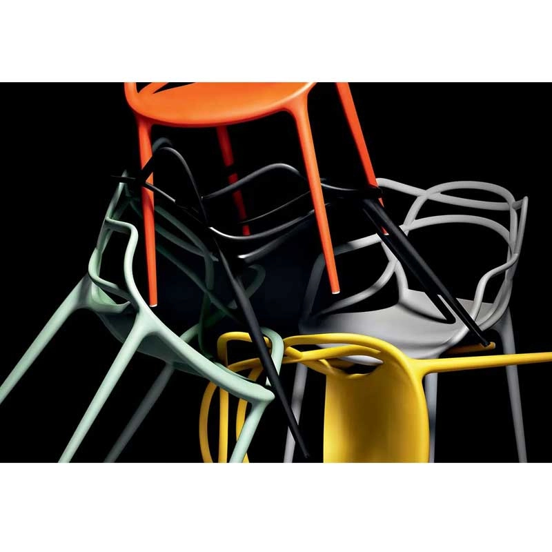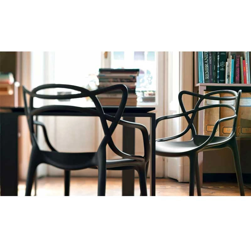 Les designers Philippe Starck et Eugeni Quitllet rendent hommage à trois icônes du design contemporain et donne vie à une fusion de styles pour obtenir une "synthèse stylistique". En effet, l’entrelacement de lignes sinueuses et dynamiques sur le dossier de la chaise Masters, évoque les silhouettes de trois classiques du design contemporain : la Série 7 d'Arne Jacobsen, la Tulip Armchair d'Eero Saarinen et la Eiffel Chair de Charles Eames. Crée en 2009, la chaise Masters de Kartell a déjà atteint le statut d’icône du design. Ces chaises s’entrelacent créant une fusion de style originale et captivante. Supportée par quatre tiges fines, l'assise du petit fauteuil Masters est ample et confortable. La particularité de la chaise Masters réside essentiellement dans son dossier, caractérisé par les pleins et les vides créés par le croisement curviligne des trois différents dossiers qui confluent dans l'assise. La finition exceptionnelle de la chaise Masters résulte de l’excellente qualité des matériaux et de la finesse des lignes. En effet, la chaise Masters se distingue également par un toucher de velours d’une grande sensualité. Fabriquée en polypropylène, la chaise Masters est ultra originale, ample et confortable. Légère, pratique, empilable, la chaise Masters de la maison italienne Kartell est disponible en plusieurs couleurs et peut être utilisée aussi bien à l'intérieur qu'à l'extérieur. Ce véritable best-seller international a été récompensé par le prix Good Design Award en 2010 et par le Red Dot Award en 2013.
