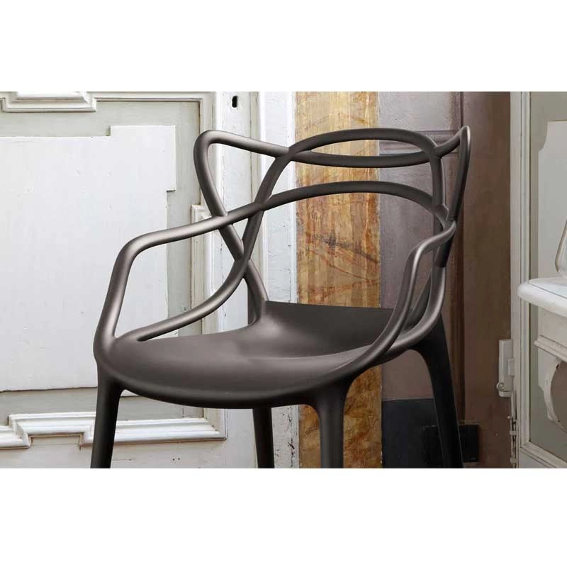 Les designers Philippe Starck et Eugeni Quitllet rendent hommage à trois icônes du design contemporain et donne vie à une fusion de styles pour obtenir une "synthèse stylistique". En effet, l’entrelacement de lignes sinueuses et dynamiques sur le dossier de la chaise Masters, évoque les silhouettes de trois classiques du design contemporain : la Série 7 d'Arne Jacobsen, la Tulip Armchair d'Eero Saarinen et la Eiffel Chair de Charles Eames. Crée en 2009, la chaise Masters de Kartell a déjà atteint le statut d’icône du design. Ces chaises s’entrelacent créant une fusion de style originale et captivante. Supportée par quatre tiges fines, l'assise du petit fauteuil Masters est ample et confortable. La particularité de la chaise Masters réside essentiellement dans son dossier, caractérisé par les pleins et les vides créés par le croisement curviligne des trois différents dossiers qui confluent dans l'assise. La finition exceptionnelle de la chaise Masters résulte de l’excellente qualité des matériaux et de la finesse des lignes. En effet, la chaise Masters se distingue également par un toucher de velours d’une grande sensualité. Fabriquée en polypropylène, la chaise Masters est ultra originale, ample et confortable. Légère, pratique, empilable, la chaise Masters de la maison italienne Kartell est disponible en plusieurs couleurs et peut être utilisée aussi bien à l'intérieur qu'à l'extérieur. Ce véritable best-seller international a été récompensé par le prix Good Design Award en 2010 et par le Red Dot Award en 2013.