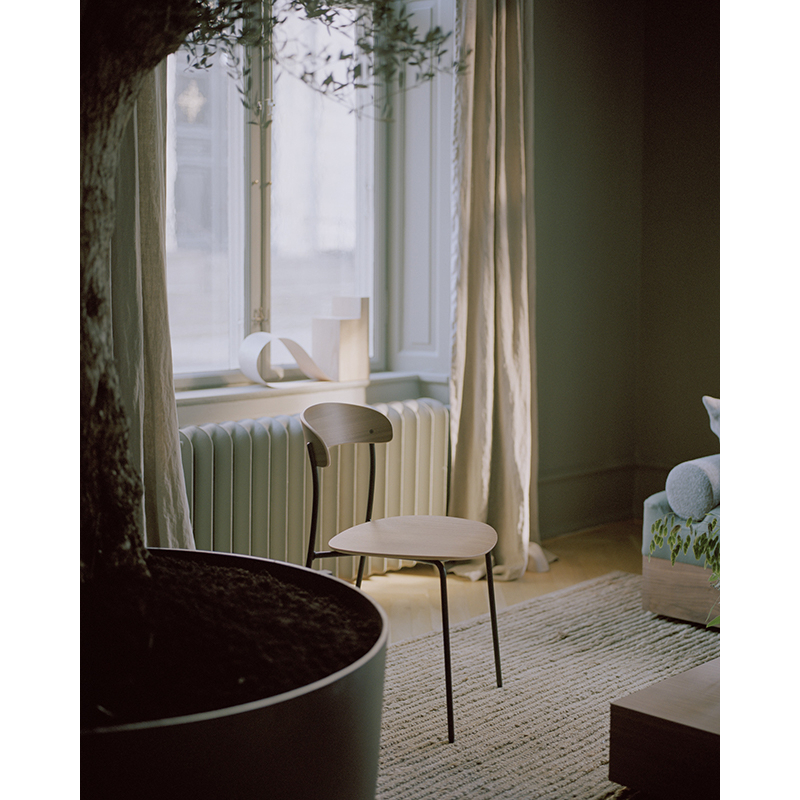 Edité par New Works, la chaise Missing apparait comme un dessin au trait qui aurait pris vie. Sensuelle mais forte, la courbe douce de chaque ligne crée une fantaisie difficile à décrire. Les lignes droites ont été adoucies, ce qui donne l'impression que le siège et le dossier flottent au-dessus de la structure en acier mince. Le résultat est un siège qui va à l'essentiel, une interprétation contemporaine et fonctionnelle de la modeste chaise de café : légère, empilable et durable, complétée par une silhouette très confortable.