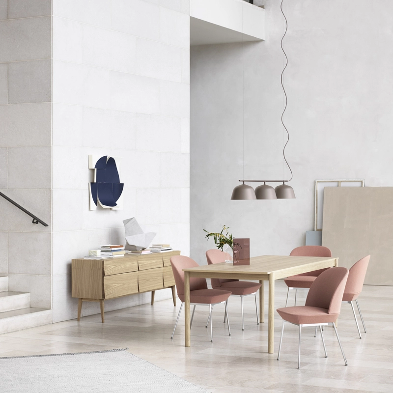 chaise Oslo conjugue modernité et grand confort dans une silhouette enveloppante et élégante. Les designers Anderssen & Voll reprennent les éléments caractéristiques des canapés et fauteuils de la collection pour les adapter à la typologie des chaises. Le résultat est un siège à la fois accueillant et sculptural, composé d’une assise et d’un dossier entièrement rembourrés, soutenus par des pieds fins en métal qui donnent de la légèreté à l’ensemble. Editée par