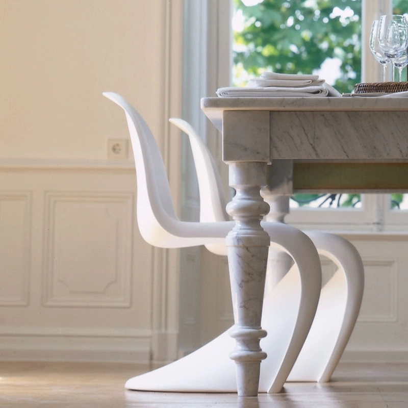 La chaise Panton, créée par Verner Panton dans les années 60, est une véritable icône de l'histoire du mobilier. Verner Panton fut un des designers extrêmement influents au cours de années 1960s et 1970s. Né au Danemark, il s’installa en Suisse à l’occasion de la mise au point de la chaise Panton. Virtuose de la couleur, on lui doit de nombreux meubles luminaires et textiles. Ici, l'ambition de ce designer de génie était de créer une chaise moulée d'une seule pièce, qui soit confortable et adaptée à un usage universel. La chaise Panton marqua l’histoire du design tant par sa forme que par la technique utilisée pour la produire. En effet, la Panton chair fut la première chaise en plastique réalisée d’une seule pièce. Fruit de plusieurs années de recherche en collaboration avec Vitra, la Panton Chair fut présentée pour la première fois en 1967. C’est également à partir de cette date qu’elle fut produite en série. La Panton chair est un classique de l’histoire du mobilier auquel le designer a donné son nom. Elle fut récompensée par de nombreux prix et fut l’une des premières chaises à intégrer les expositions permanentes du Museum of Modern Art de New York. La technique du siège à oscillation libre, alliée à une forme adaptée au corps et à un matériau souple, confère à cette chaise un grand confort d'assise. Le confort de la chaise Panton tient autant à sa forme organique qu’à la souplesse de sa matière. Depuis sa création, la Panton Chair a connu plusieurs phases de fabrication liées aux progrès techniques réalisés dans le traitement des plastiques. C'est à la fin des années 90 qu'est née, chez Vitra, la dernière version du siège autorisée par le créateur. Cette version 100% polypropylène a permis de proposer cette chaise comme un produit industriel bon marché. Sur cette chaise, des additifs spéciaux ralentissent la décoloration due aux rayonnements ultraviolets. Elle est disponible également dans sa version originale de 1960, la Panton Classic, et dans une version enfant.