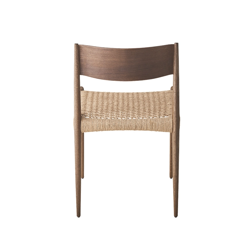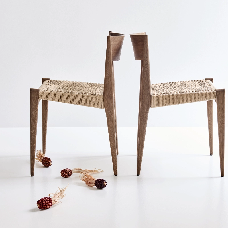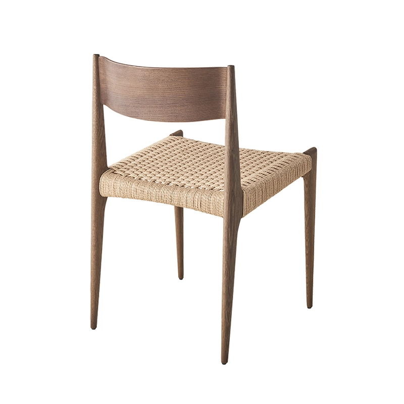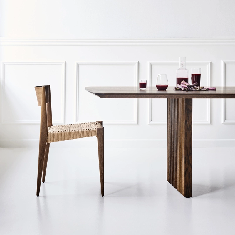 Les pieds fins et coniques en bois massif donnent à la chaise Pia DK3 une expression visuelle légère. L'assise est réalisée en cordelette de papier tressée à la main, et le dossier est moulé, ce qui confère un confort d'assise optimal.