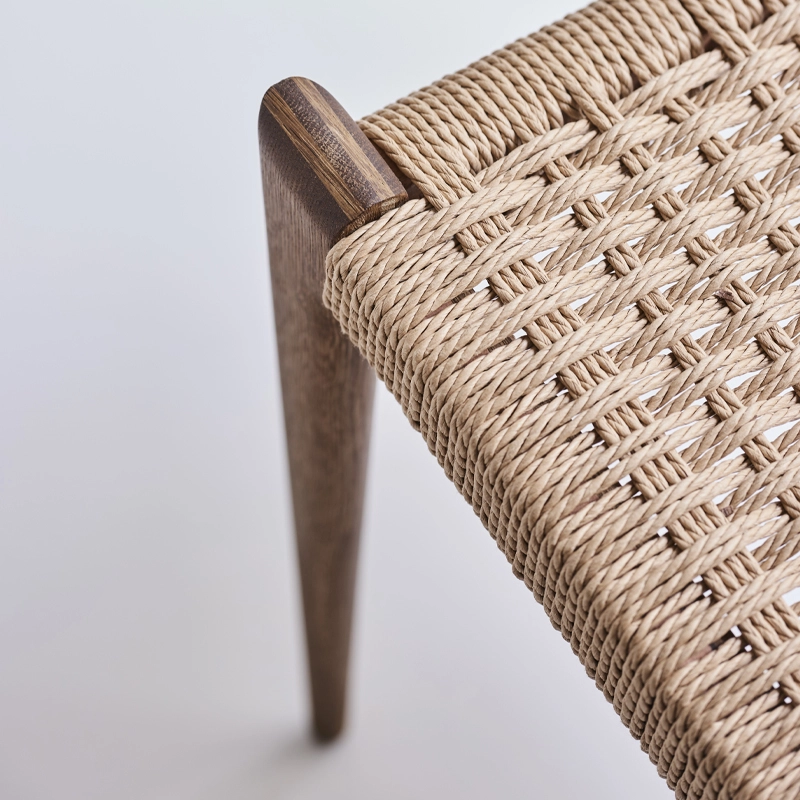 bois massif, dossier contreplaqué, assise corde de papier tissée à la main