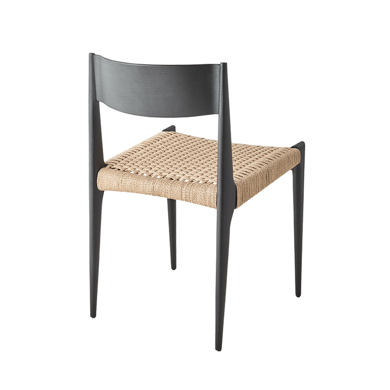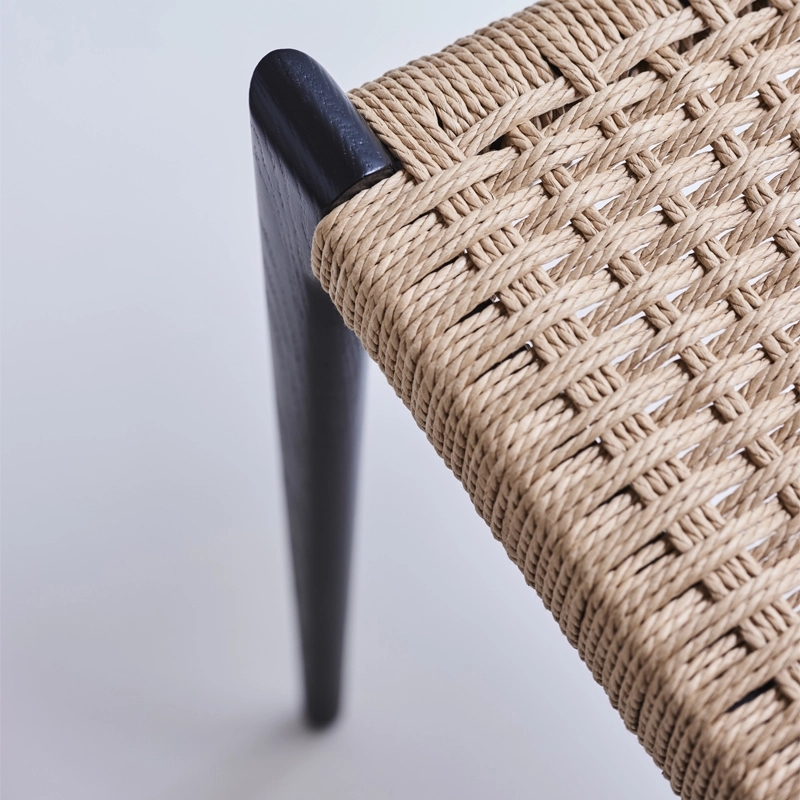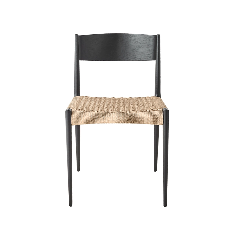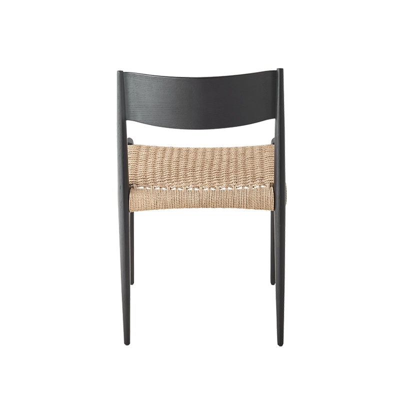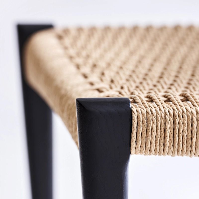 bois massif, dossier contreplaqué, assise corde de papier tissée à la main