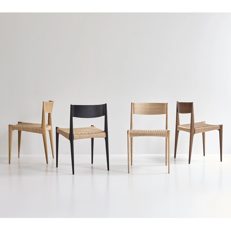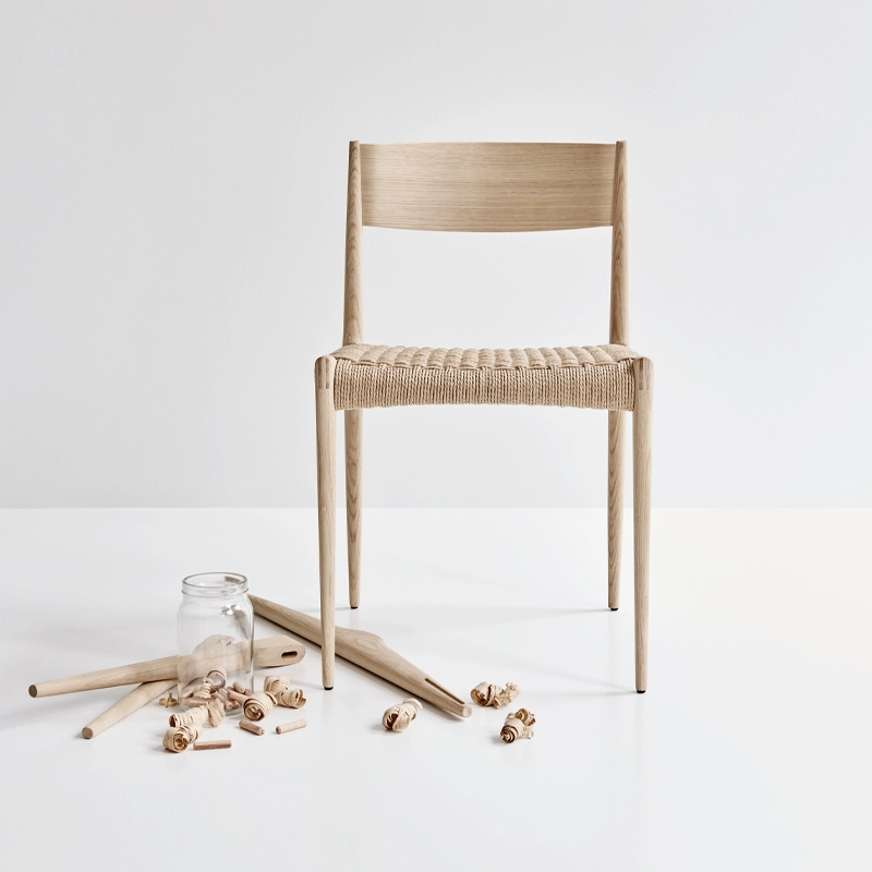 Les pieds fins et coniques en bois massif donnent à la chaise Pia DK3 une expression visuelle légère. L'assise est réalisée en cordelette de papier tressée à la main, et le dossier est moulé, ce qui confère un confort d'assise optimal.