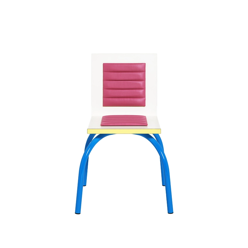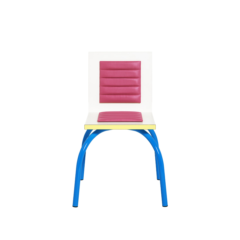 La chaise Riviera, dessinée par Michele De Lucchi, est probablement l'objet le plus proche des prototypes d'appareils d'avant-garde qu'il a créés en 1979 pour la société Girmi. Elle représente une tentative de mettre l'accent sur une relation ludique et pas seulement fonctionnelle avec les objets utiles de tous les jours. Riviera est une chaise qui nous surprend par sa forme ludique : sa base est composée de deux arcs bleus croisés, tandis que l'assise est pliée comme un livre. La chaise Riviera Memphis est composée de stratifié décoratif avec un revêtement en tissu et des pieds en métal peint. Ce produit est livré avec un certificat d'authenticité.
