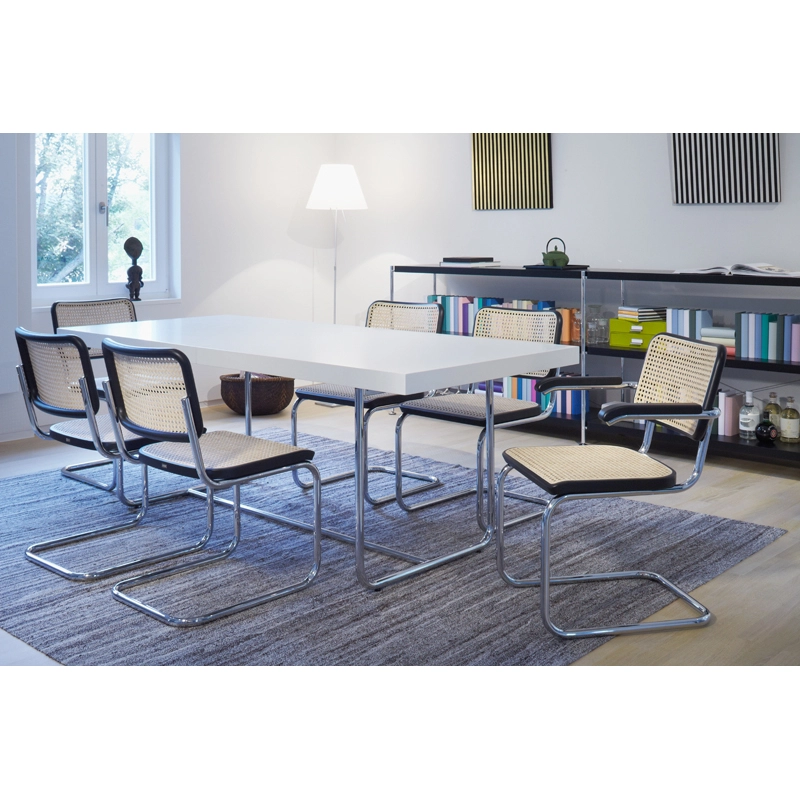Edité par Thonet, le siège à piètement luge S 32 est le plus universel des meubles en acier tubulaire. Naviguant aisément entre les différents styles de décoration, il s’intègre parfaitement aussi bien dans une pièce résolument moderne que dans un espace où différents styles et époques se rencontrent. Le siège à piètement luge S 32 et la variante S 64 avec accoudoirs sont sans aucun doute les classiques en acier tubulaire les plus connus. Leur popularité vient de l’alliance réussie du neuf et de l’ancien avec, d’une part, la tradition de Thonet en tant que fabricant de meubles en bois courbé tendus d’un cannage viennois typique, d’autre part, l’emploi révolutionnaire d’acier tubulaire. Le dossier et l’assise en bois massif et cannage incarnent la tradition, le piètement symbolise le présent et l’avenir. Marcel Breuer dessine les modèles S 32 et S 64 en 1928, pendant ses années à Berlin. Thonet produit ces deux modèles depuis 1930. Grâce à leur réduction esthétique, la clarté de leurs formes et la légèreté du cannage, les sièges S 32 et S 64 s’adaptent à tout type d’environnement, comme les salles de conférence, les salles d’attente, les restaurants et les intérieurs privés.