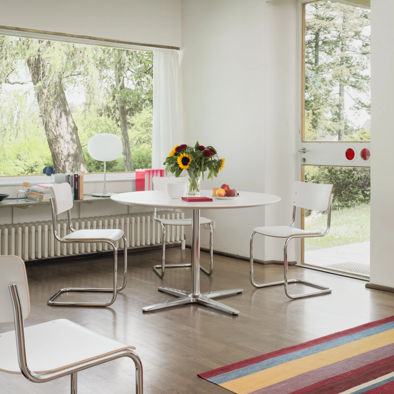 En 1931, Mart Stam révolutionne un concept suivi pendant des siècles en débarrassant les chaises de leurs pieds arrière. Cette idée sera par la suite développée et affinée, donnant naissance à un objet parfait pour les environnements où sobriété et qualité sont de mise. Ce qui compte pour Mart Stam lorsqu’il dessine des meubles, c’est l’utilité et l’aspect économique du meuble, que ce soit sur le plan esthétique ou de la réduction des matériaux. Le résultat est une chaise à la forme rectiligne, dotée d’une construction épurée et d’un confort d’assise amélioré. Son modèle le plus minimaliste est la chaise à piètement luge S 43, pour laquelle il combine une structure en acier tubulaire à un dossier et une assise en bois moulé. La clarté et la sobriété de ce siège à piètement luge reflètent parfaitement l’esprit de modernité de l’époque. Le droit de propriété artistique pour cette chaise de style rigoureusement cubique sans pieds arrière est aujourd’hui détenu par Thonet. Durable est intemporelle, la chaise S 43 trouve sa place dans de nombreux environnements, privés ou publics.