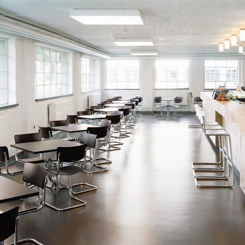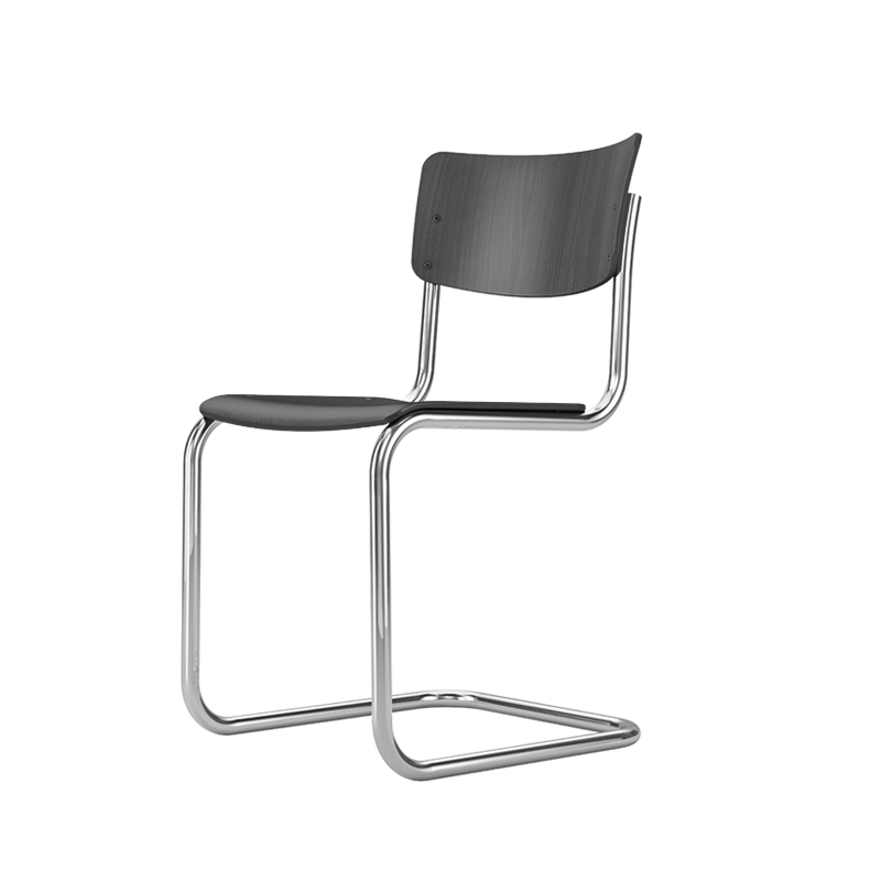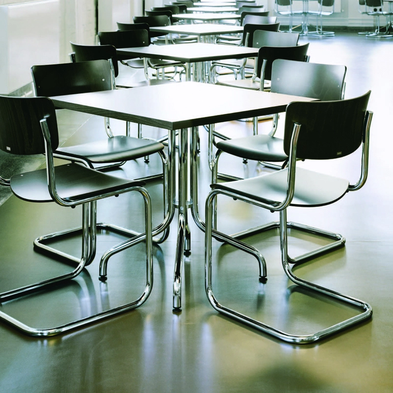 En 1931, Mart Stam révolutionne un concept suivi pendant des siècles en débarrassant les chaises de leurs pieds arrière. Cette idée sera par la suite développée et affinée, donnant naissance à un objet parfait pour les environnements où sobriété et qualité sont de mise. Ce qui compte pour Mart Stam lorsqu’il dessine des meubles, c’est l’utilité et l’aspect économique du meuble, que ce soit sur le plan esthétique ou de la réduction des matériaux. Le résultat est une chaise à la forme rectiligne, dotée d’une construction épurée et d’un confort d’assise amélioré. Son modèle le plus minimaliste est la chaise à piètement luge S 43, pour laquelle il combine une structure en acier tubulaire à un dossier et une assise en bois moulé. La clarté et la sobriété de ce siège à piètement luge reflètent parfaitement l’esprit de modernité de l’époque. Le droit de propriété artistique pour cette chaise de style rigoureusement cubique sans pieds arrière est aujourd’hui détenu par Thonet. Durable est intemporelle, la chaise S 43 trouve sa place dans de nombreux environnements, privés ou publics.