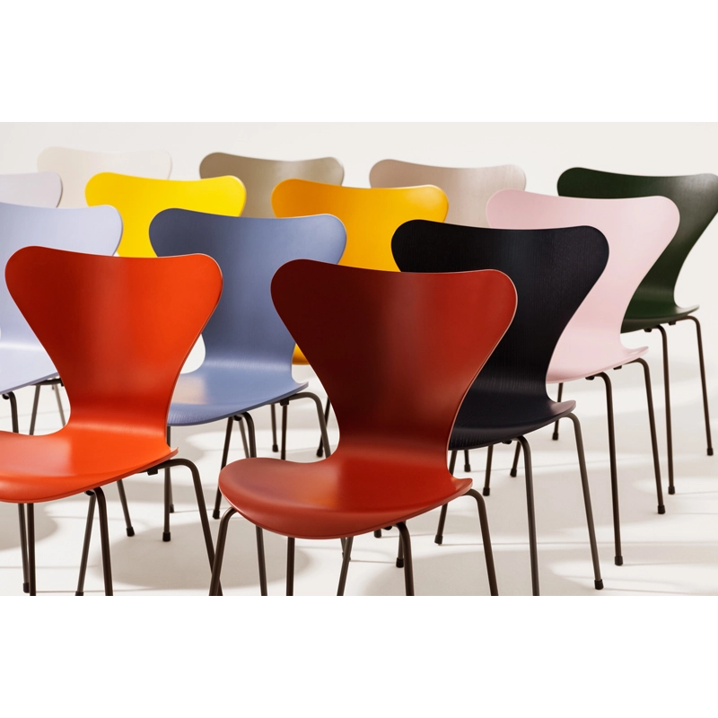 Les chaises Série 7, dessinées par Arne Jacobsen en 1955, sont de loin les chaises les plus vendues de l'histoire du fabricant Fritz Hansen. Classiques du design, elles font partie de notre quotidien.  Visionnaire, Arne Jacobsen a exploité les possibilités du placage et moulage du bois déjà employé sur la chaise Fourmi en 1952, pour parvenir à la forme iconique de la Série 7. Légère et empilable, elle s'impose dans tous les espaces par sa forme douce et son confort. Sa structure chromée s'associe avec un siège en noyer, chêne, chêne foncé, ou frêne coloré. La Série 7 se décline également en version enfant.