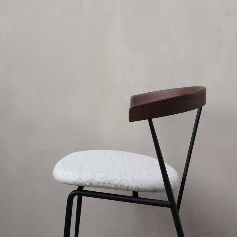 dossier noyer, assise tissu dedar ou gabriel, acier finition époxy noir