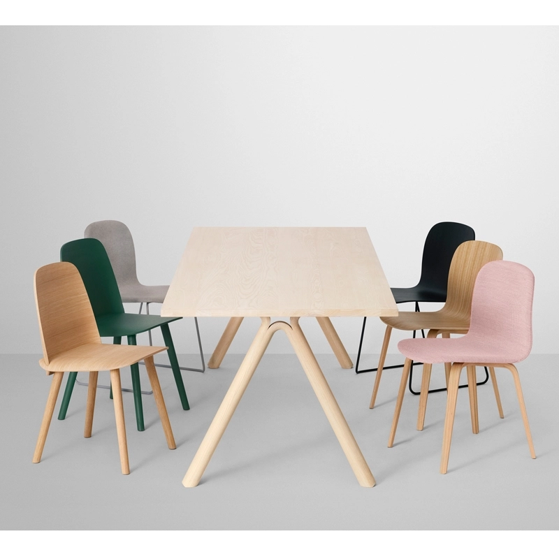Visu est une collection de sièges dessinée par Mika Tolvanen pour Muuto. Après les paniers Restore, le designer réinterprète la traditionnelle chaise en contreplaqué moulé. Il crée ainsi une famille d'assises modernes pour différents usages : une chaise avec un piètement luge ou avec des pieds bois, une chauffeuse et un tabouret de bar. Ces sièges sont disponibles dans plusieurs couleurs de bois ou recouverts de tissu. Chacun peut ainsi trouver le fauteuil qui lui correspond ou créer des mélanges de couleurs de chaises à placer autour de la table de la salle à manger. La chauffeuse prend peu de place et s'accorde facilement avec tous les styles de meubles dans le salon.